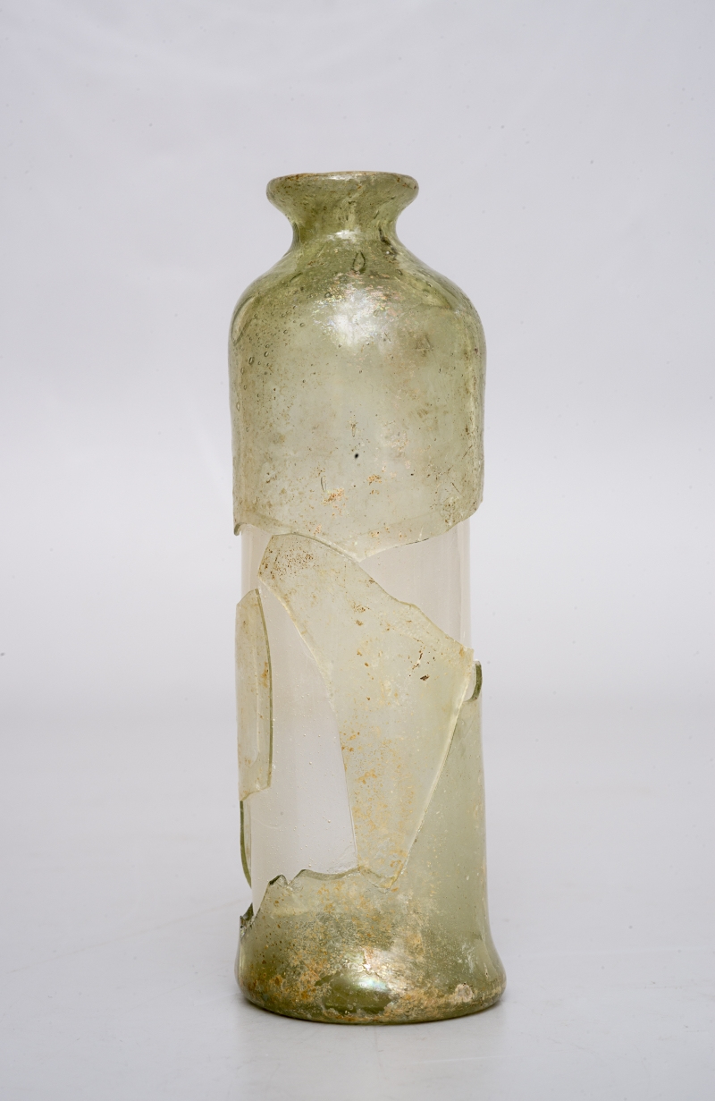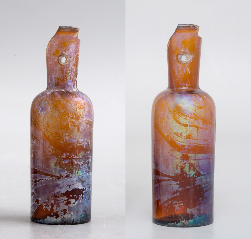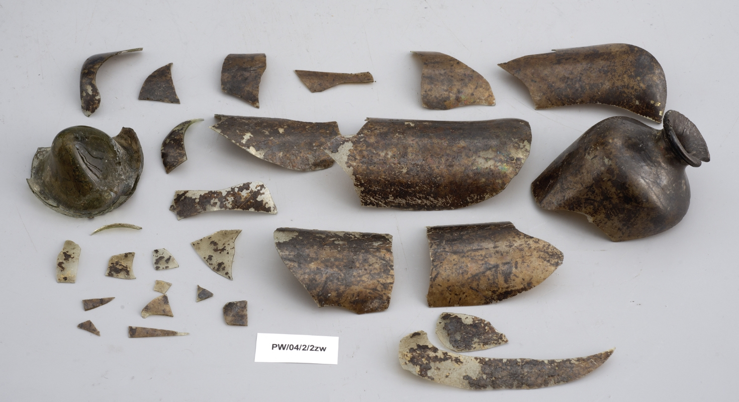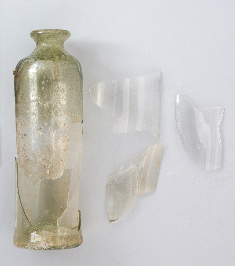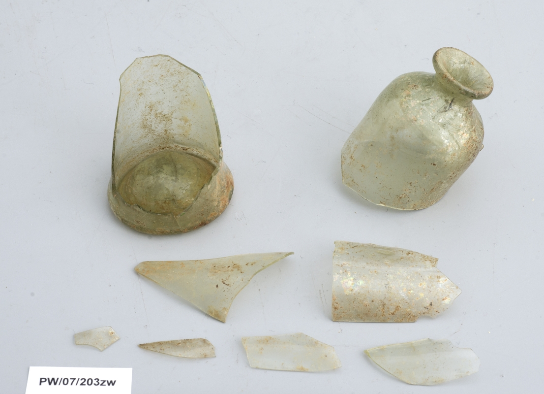 Znaczna część obiektów wydobytych w trakcie prowadzonych w latach 2004–2008 badań archeologicznych, zachowała się w stanie szczątkowym – uległa znacznej deterioracji, jednak dzięki analizie porównawczej jesteśmy w stanie zinterpretować ich pierwotny kształt. Dwie buteleczki (PW/04/2/2zw; PW/07/203zw) wykonane są z jasnozielonego szkła z licznymi kulistymi i eliptycznymi pęcherzykami gazowymi oraz z niewielkimi zanieczyszczeniami w postaci ciemnych i białych cząsteczek świadczących o niewłaściwie oczyszczonych składnikach wykorzystanych do produkcji szkła i niedostatecznie przetopionej masie szklanej. Buteleczki wykonano przy użyciu piszczeli poprzez swobodne wydmuchiwanie masy szklanej. Świadczy o tym niejednorodna grubość szkła (cieńsza w korpusie, grubsza w obrębie wylewu i dna), a także smugi w postaci bardzo małych pęcherzyków powietrza, rozmieszczonych wzdłuż pionowej osi naczyń.