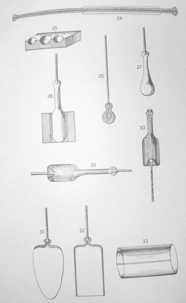 Szkła wykorzystywane do celów aptekarskich, lekarskich i alchemicznych charakteryzowały się zazwyczaj niewielkimi rozmiarami, posiadały mocno wywinięte na zewnątrz kołnierze, które umożliwiały zatykanie ich miękkimi zawiązkami.