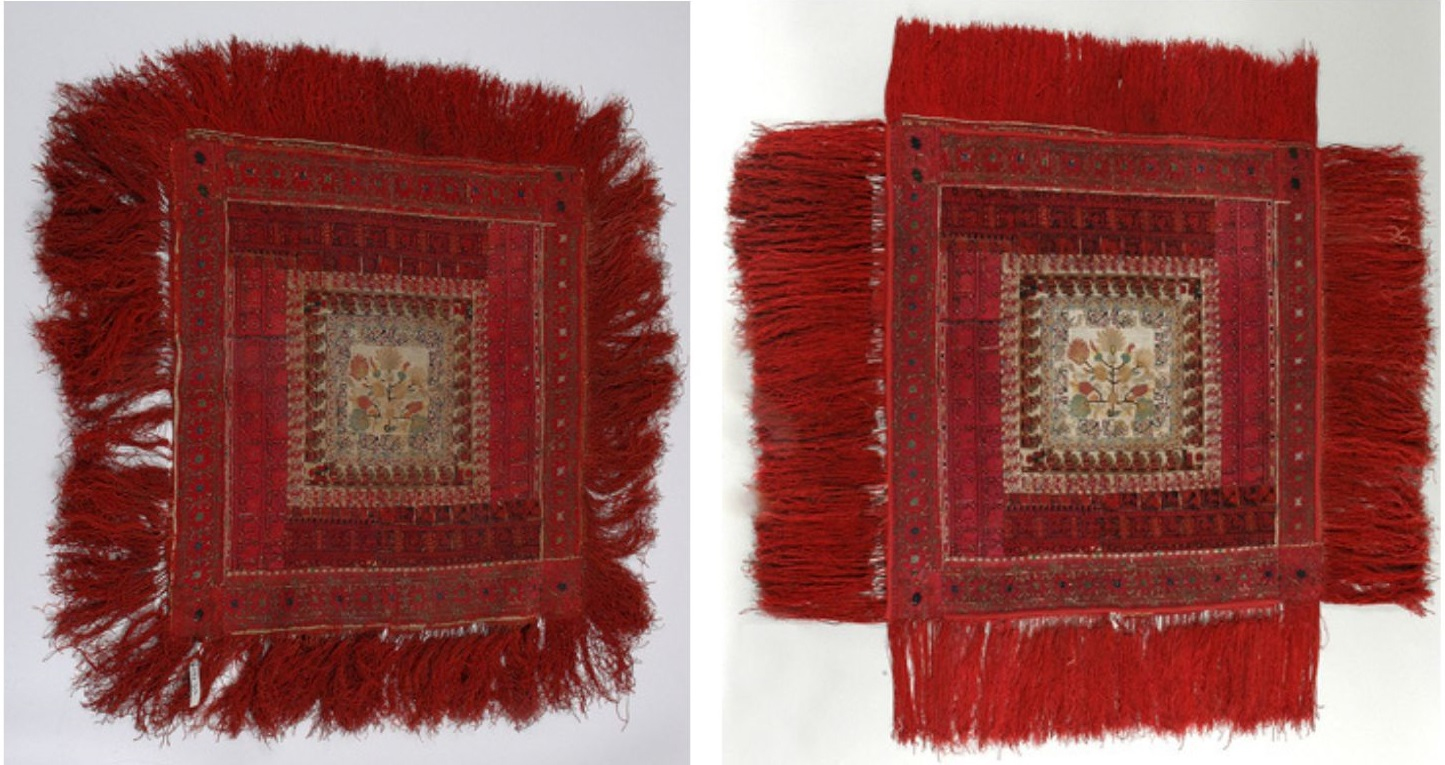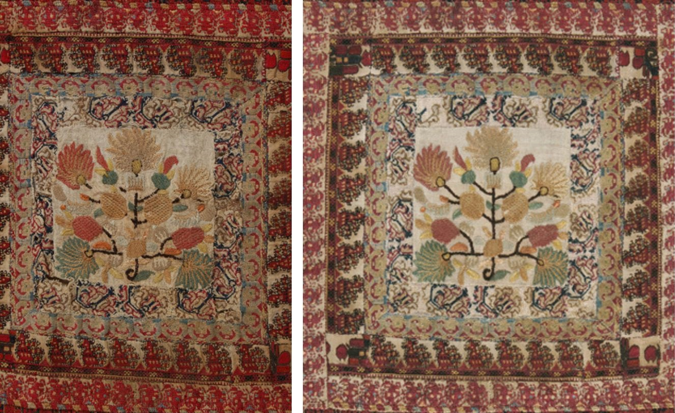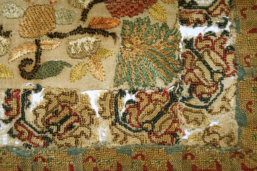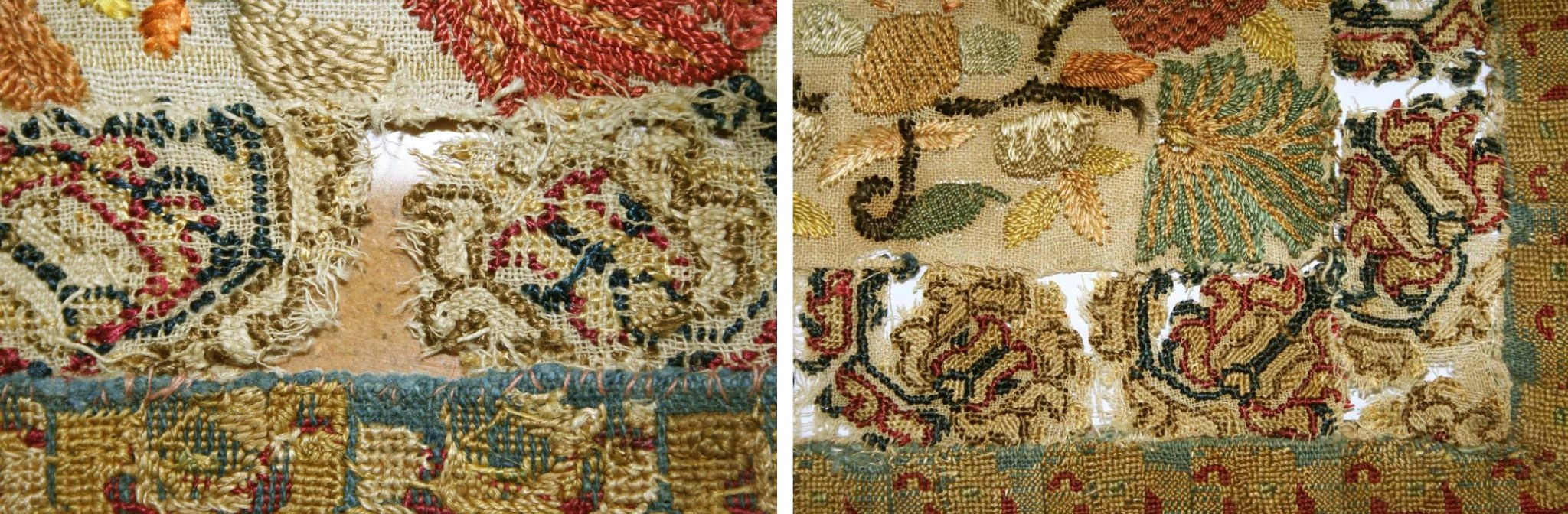 Ubytki tkaniny bawełnianej uzupełniono podkładając od strony rewersu bawełnianą surówkę ufarbowaną na kolor bliski oryginalnemu, a rozsnutą przędzę jedwabną haftu uporządkowano i przymocowano do dublażu [2]. W środkowym polu zrekonstruowane zostały, ciemnobrązowym jedwabiem, brakujące elementy gałązki z kwiatami.