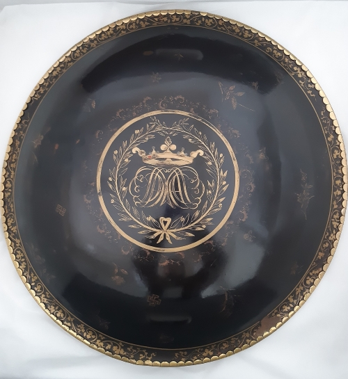 Okrągła tarcza o średnicy 54,0 cm wykonana jest ze skóry pokrytej obustronnie naturalną czarną laką, w języku japońskim zwaną urushi. Środek awersu zdobi dekoracja w postaci koła z monogramem zwieńczonym koroną w wieńcu laurowym. Wianek otoczony jest motywem roślinnej wici, takiej samej jak na wąskiej ramce z tłem nashiji[1] na całym obwodzie. Na gładkiej czarnej lace po stronie wypukłej i wklęsłej znajdują się kwitnące rośliny i kilka geometrycznych orientalnych motywów. Dekorację wykonano techniką złotego i srebrnego maki-e (prószenia złotego proszku), chociaż dodano również sporo elementów w lakierach europejskich.