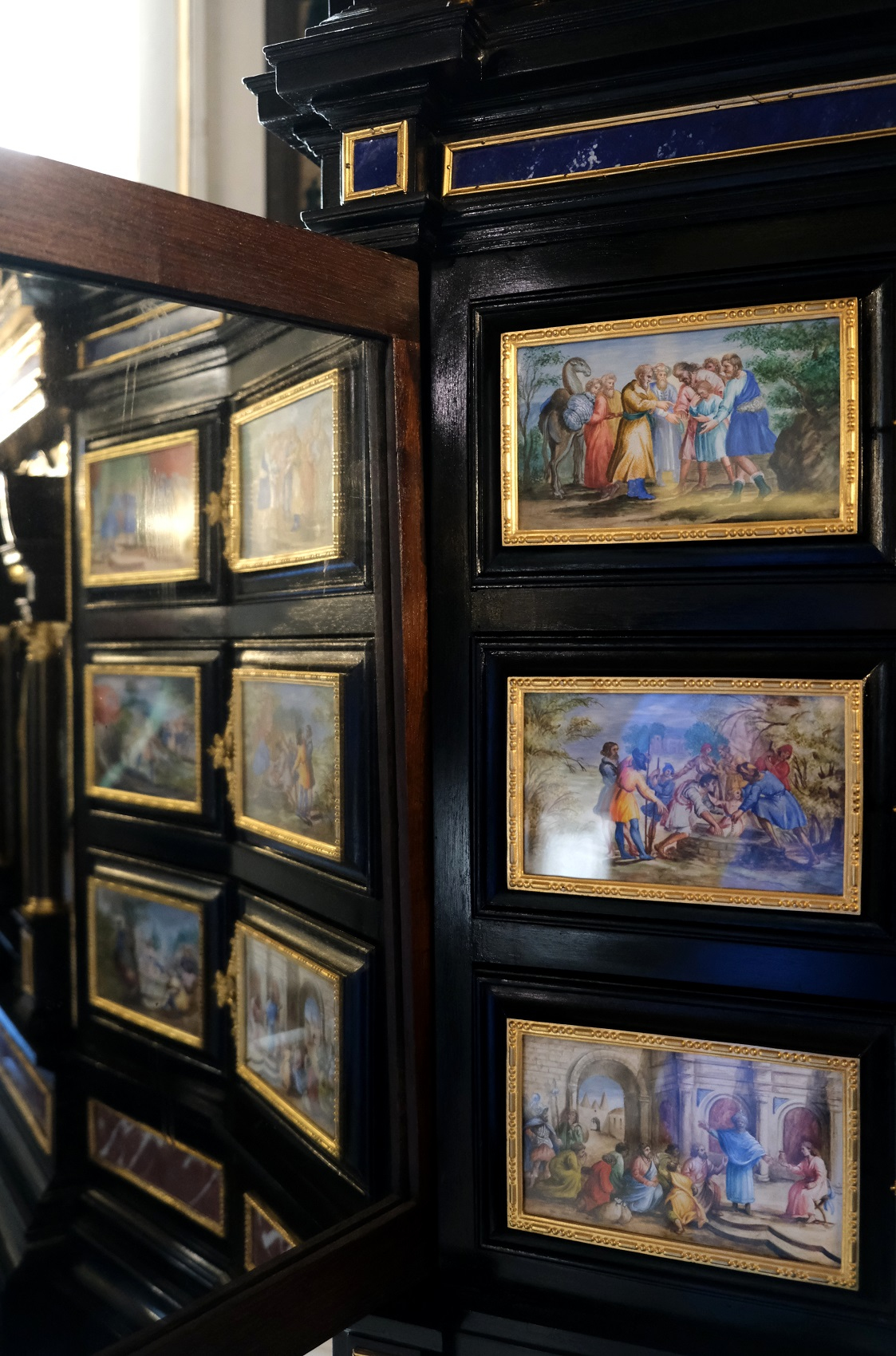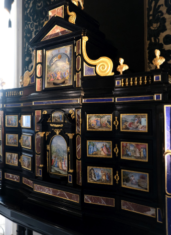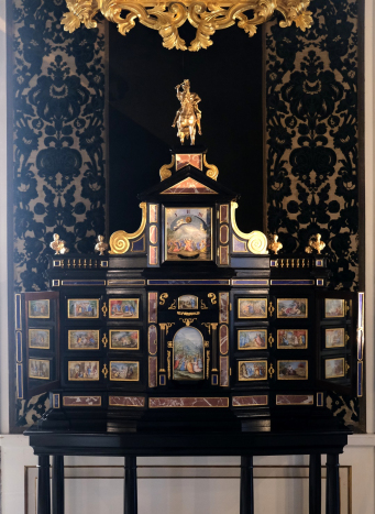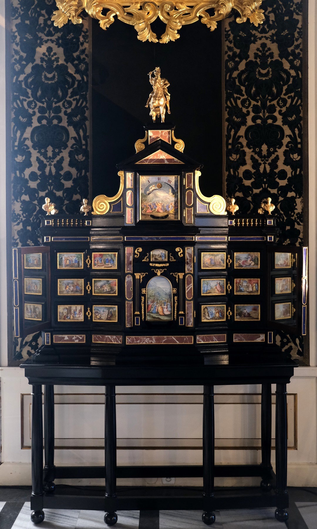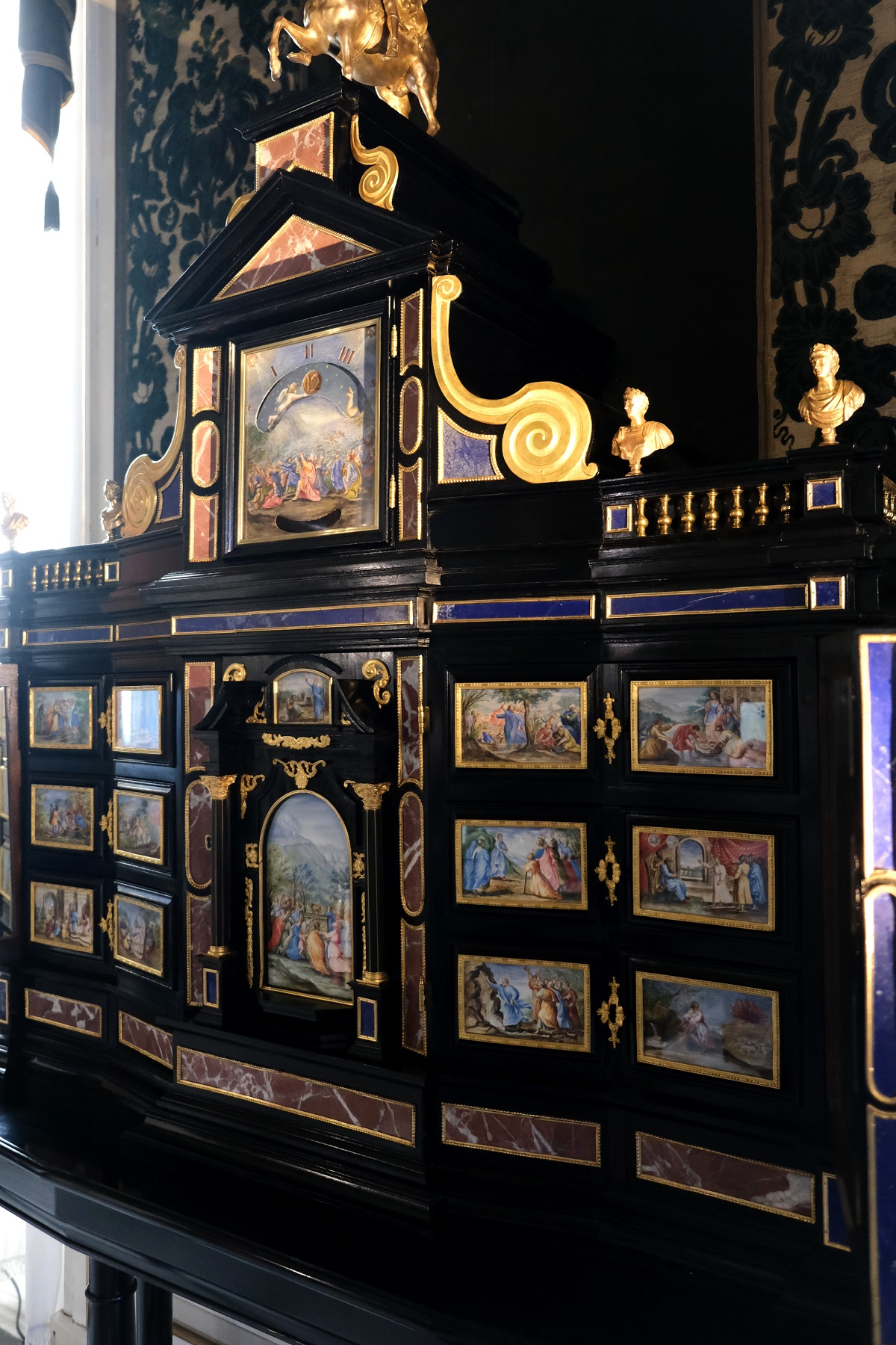 To wyjątkowe dzieło należy do grupy najcenniejszych, najwyższej klasy mebli zwanych kabinetami, które były prestiżową ozdobą apartamentów dworów królewskich. Jest to wieloszufladowa szafa ustawiona na wysokiej podstawie, dekorowana cennymi okładzinami z hebanu, lapis lazuli i wielobarwnego marmuru. Ścianki fasady zdobią miniaturowe malowidła przedstawiające biblijne historie Józefa i Mojżesza. Temat i kompozycja tych scen nawiązuje do dzieł renesansowego mistrza Rafaela Santi w loggiach watykańskich. Centralne miejsce kabinetu zajmuje komora imitująca miniaturową komnatę z lustrzanymi ściankami, kolumnami i dekoracyjną posadzką. W szczycie mebla umieszczono zegar nocny, w zwieńczeniu - wykonane z brązu konne przedstawienie Marka Kurcjusza, legendarnego zbawcy Rzymu i popiersia rzymskich cesarzy. Szuflada w cokole mieściła niezachowany instrument muzyczny zwany wirginałem. Intrygującymi elementami, których funkcja pozostaje tajemnicą, są dwa duże, wysuwane z bocznych ścianek lustra oraz dwie tajne komory.
