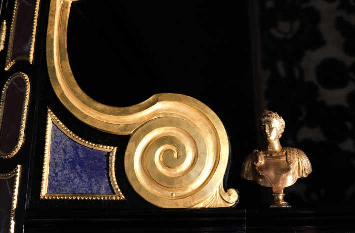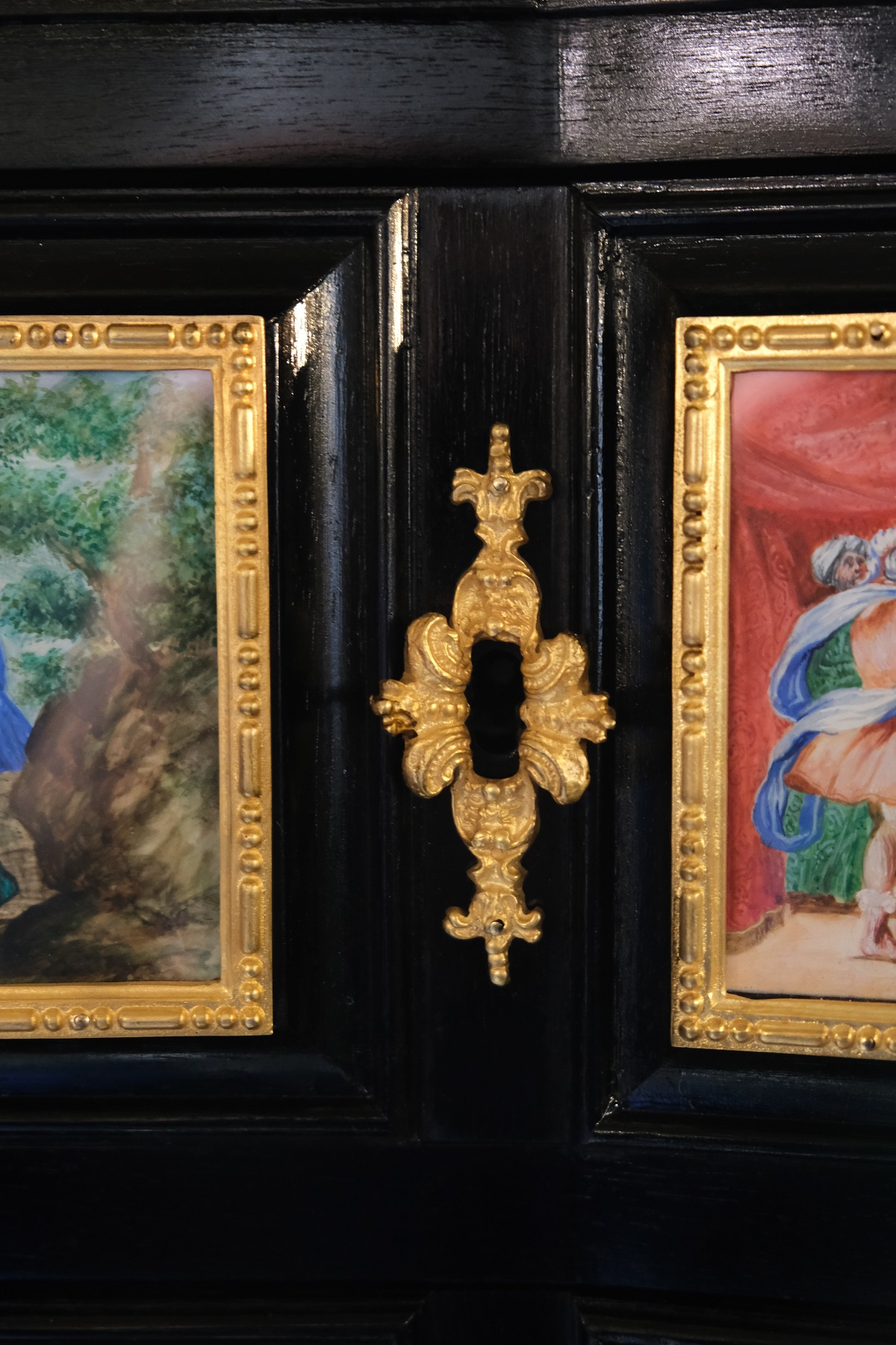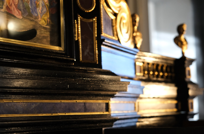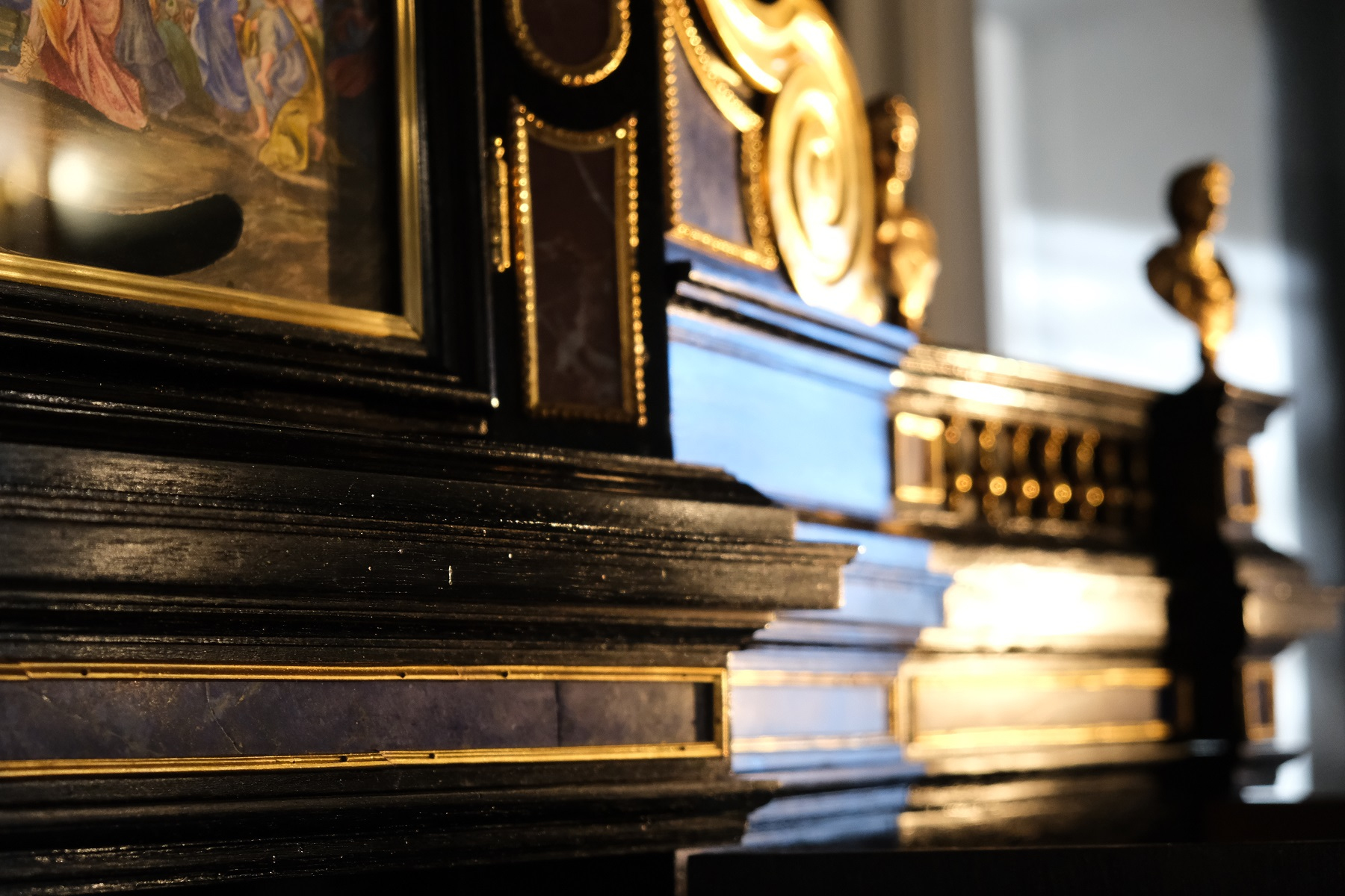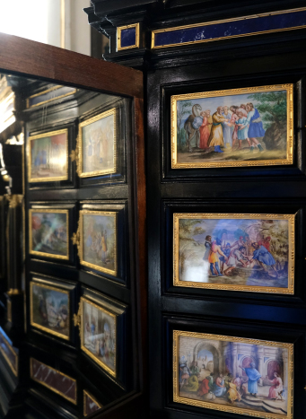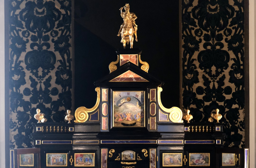 To wyjątkowe dzieło należy do grupy najcenniejszych, najwyższej klasy mebli zwanych kabinetami, które były prestiżową ozdobą apartamentów dworów królewskich. Jest to wieloszufladowa szafa ustawiona na wysokiej podstawie, dekorowana cennymi okładzinami z hebanu, lapis lazuli i wielobarwnego marmuru. Ścianki fasady zdobią miniaturowe malowidła przedstawiające biblijne historie Józefa i Mojżesza. Temat i kompozycja tych scen nawiązuje do dzieł renesansowego mistrza Rafaela Santi w loggiach watykańskich. Centralne miejsce kabinetu zajmuje komora imitująca miniaturową komnatę z lustrzanymi ściankami, kolumnami i dekoracyjną posadzką. W szczycie mebla umieszczono zegar nocny, w zwieńczeniu - wykonane z brązu konne przedstawienie Marka Kurcjusza, legendarnego zbawcy Rzymu i popiersia rzymskich cesarzy. Szuflada w cokole mieściła niezachowany instrument muzyczny zwany wirginałem. Intrygującymi elementami, których funkcja pozostaje tajemnicą, są dwa duże, wysuwane z bocznych ścianek lustra oraz dwie tajne komory.