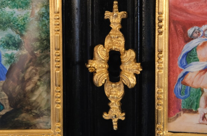 Nastawa oraz zwieńczenie mebla w swych centralnych częściach flankowane są wolutami zdobionymi metalowymi okuciami. Zostały one wykonane z blachy brązowej, którą kształtowano metodą repuserską. Polega ona na wytłaczaniu wymaganego kształtu różnymi narzędziami: punktakami, puncami i młotkami od negatywowej strony blach. Blacha na czas kształtowania przyklejona jest do warstwy smoły amortyzującej uderzenia. Trudność tej techniki polega na tym, że efekt końcowy widoczny jest dopiero po zakończeniu pracy i wydobyciu pozytywowej strony ze smoły.