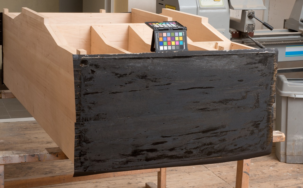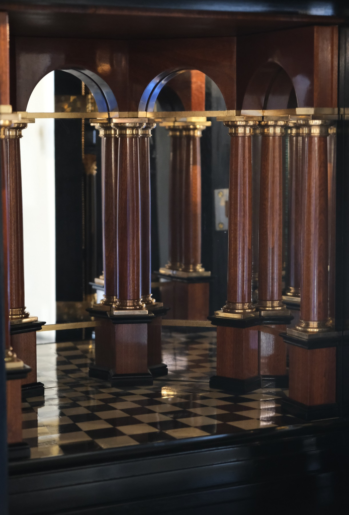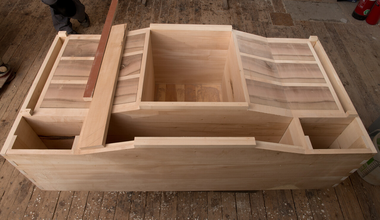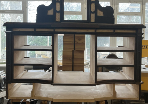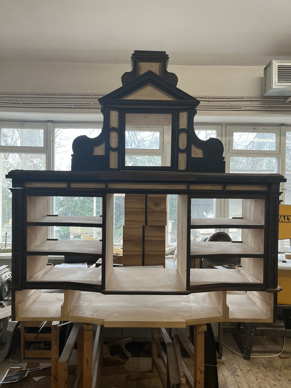 Najwięcej pracy, dużej cierpliwości oraz precyzji wymagały drzwiczki w centralnej części mebla, które były ostatnim zakończonym i zamontowanym elementem. Dużym wyzwaniem było także obudowanie skrzynek wolutowych z obu górnych kondygnacji. Ich profile stanowią odwzorowanie widocznych na froncie wolut. Falista forma wymusiła zastosowanie techniki polegającej na klejeniu wielu wąskich, cienkich listewek hebanowych do szablonu wyciętego we frontowym i tylnym elemencie konstrukcji. Następnie całość ręcznie ostrugano i wyszlifowano, aż do uzyskania gładkiej powierzchni.