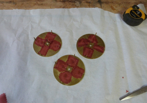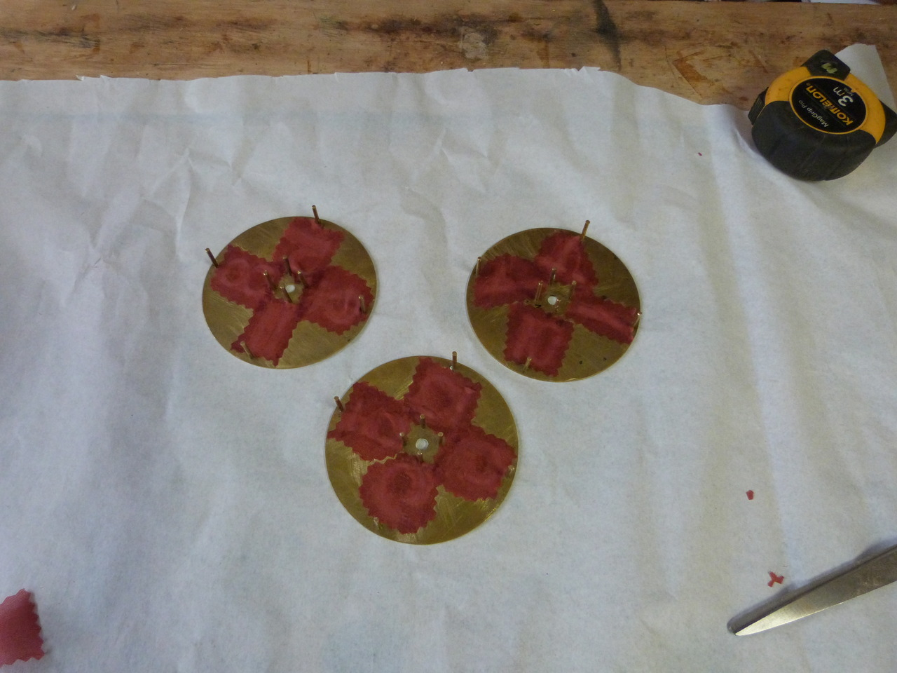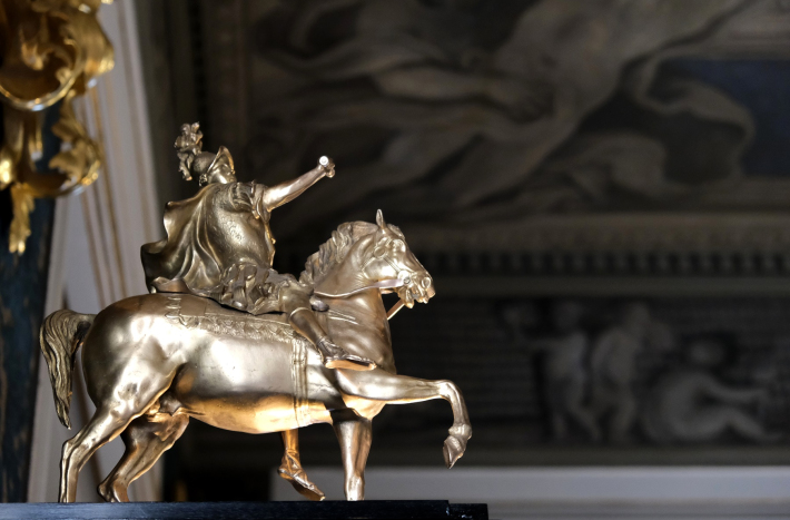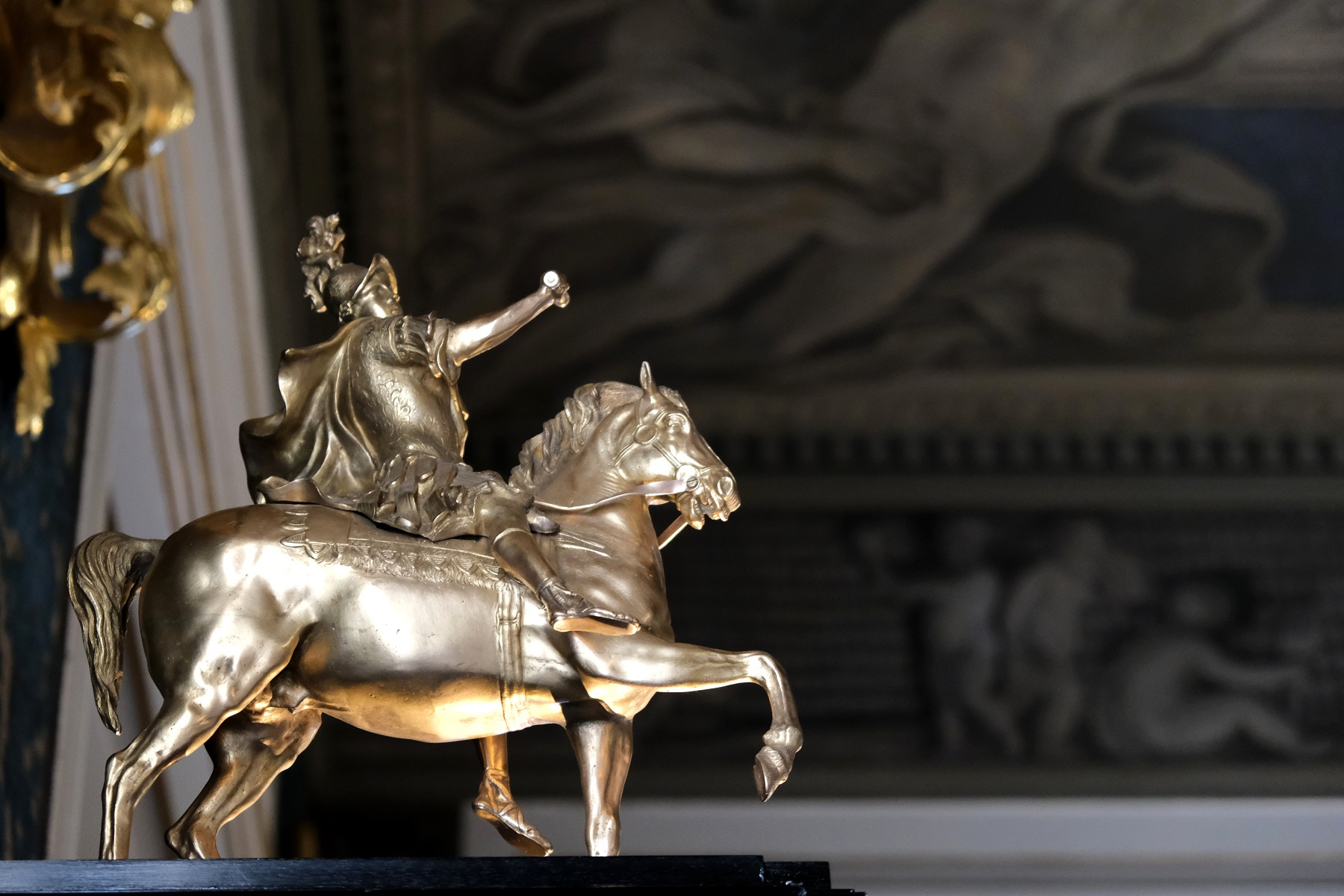 Wszystkie okucia poddano następnie procesowi złocenia. Tu celowo zadecydowano o zastosowaniu złocenia galwanicznego, które przebiega w procesie elektrolizy. Oryginalnie, w XVII wieku, złocenia te wykonywane były metodą ogniową, polegającą na rozpuszczeniu złota w rtęci i pokryciu złoconego metalu powstałym amalgamatem, a następnie odparowaniu rtęci poprzez podgrzanie do wysokiej temperatury. Z uwagi na toksyczne właściwości rtęci, w tym wypadku należało odstąpić od powtórzenia metody historycznej.