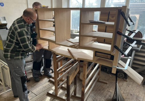 Założono, że wszystkie prace zostaną wykonane w oparciu o tradycyjne techniki stolarskie oraz materiały stosowane historycznie. Konstrukcję wykonano z drewna lipowego (jak w oryginale), a poszczególne elementy łączono z zastosowaniem tradycyjnych wczepów stolarskich, na tzw. jaskółczy ogon (wczep skośny). Do klejenia używano klejów glutynowych (klej stolarski zwany perełką) stosowanych na gorąco. Taki klej należy namoczyć w wodzie i podgrzać w kąpieli wodnej do odpowiedniej temperatury, tak aby uzyskać odpowiednią lepkość. Szuflady wykonano z drewna orzecha włoskiego. Ich konstrukcję czopowano stosując wczepy skośne półkryte (fronty) oraz wczepy skośne z tyłu szuflad.
