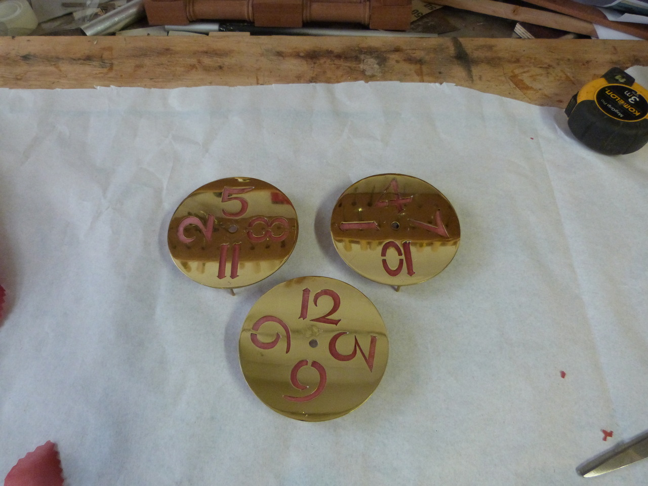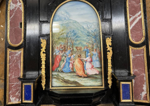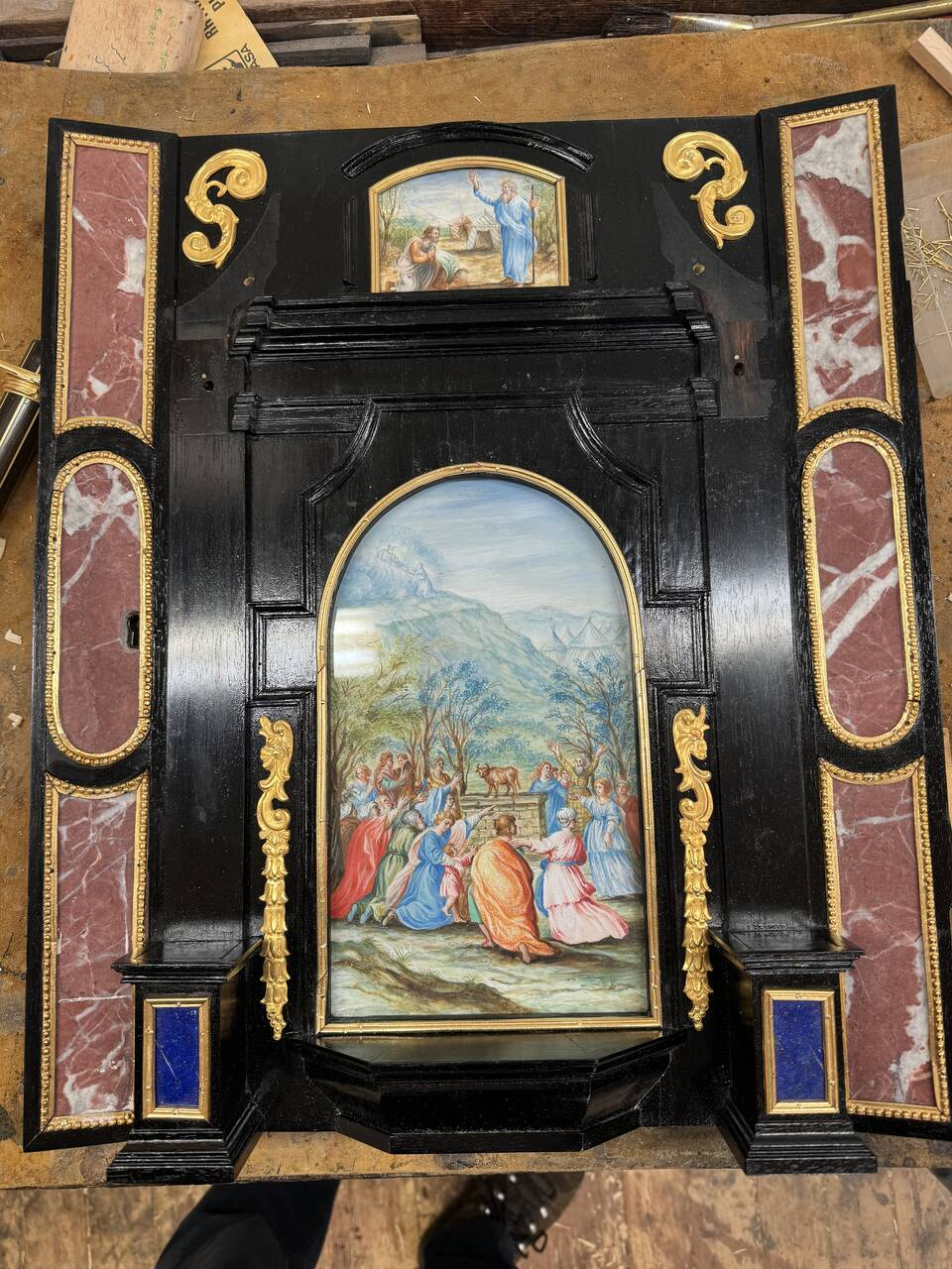 Równocześnie z pracami przy drewnianej konstrukcji trwały prace przy piętnastu kopiach miniatur zdobiących kabinet, przedstawiających sceny biblijne z życia Mojżesza oraz Józefa egipskiego. Kopie scen malowanych na pergaminie wykonywali konserwatorzy malarstwa, kopiści z warszawskiej Akademii Sztuk Pięknych. Podłożem miniatur, podobnie jak w oryginale, był cienki pergamin naciągnięty na drewnianą deseczkę. W przypadku tarczy zegara pergamin naciągnięty był na płytę z blachy miedzianej. Przedstawienia malarskie zostały wzbogacone o szczegóły, które w oryginalnych miniaturach uległy zniszczeniu lub były słabo widoczne, zrekonstruowano też całe brakujące elementy ruchomej tarczy zegarowej.