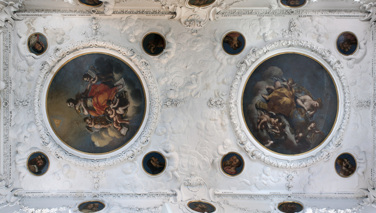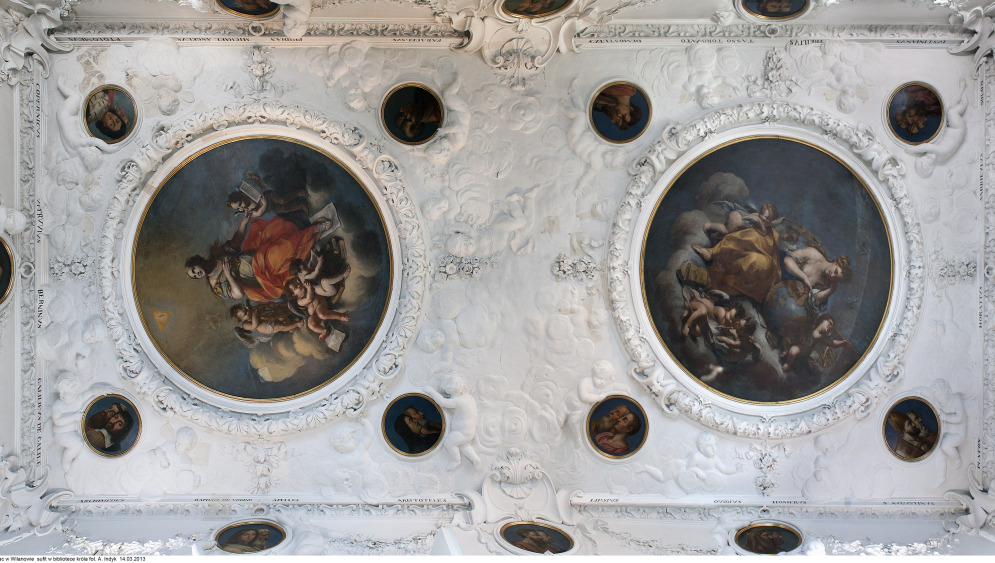 The library in the Palace was established in the 1780s for King Jan III, who was an enlightened man who read a great deal. On the ceiling, there are two circular tondo paintings with the allegories Theology and Philosophy, surrounded by a rich stucco decoration, and numerous images of artists and scholars, under which books from various fields of knowledge were placed. The original design has also been preserved in the marble floor arranged in a pattern which creates a three-dimensional illusion.