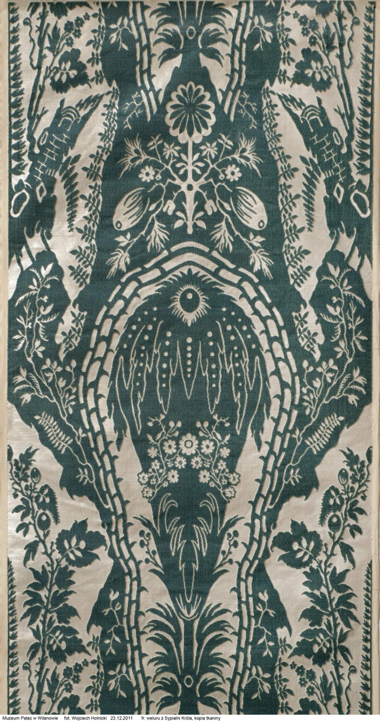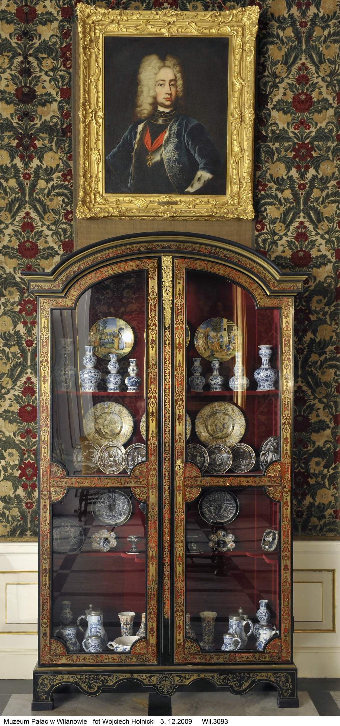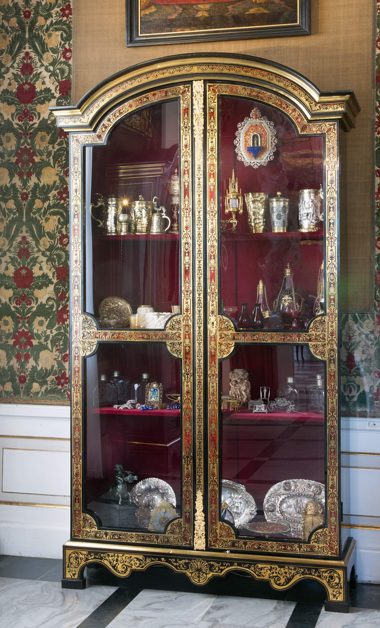 In one cabinet, the brown-red tortoise shell inlay is the background for the gold ornament, in the other, the materials are used the other way around. The cabinets are extremely valuable, in the 19th century Potocki's Museum they were used for the exposition of national historic treasures.