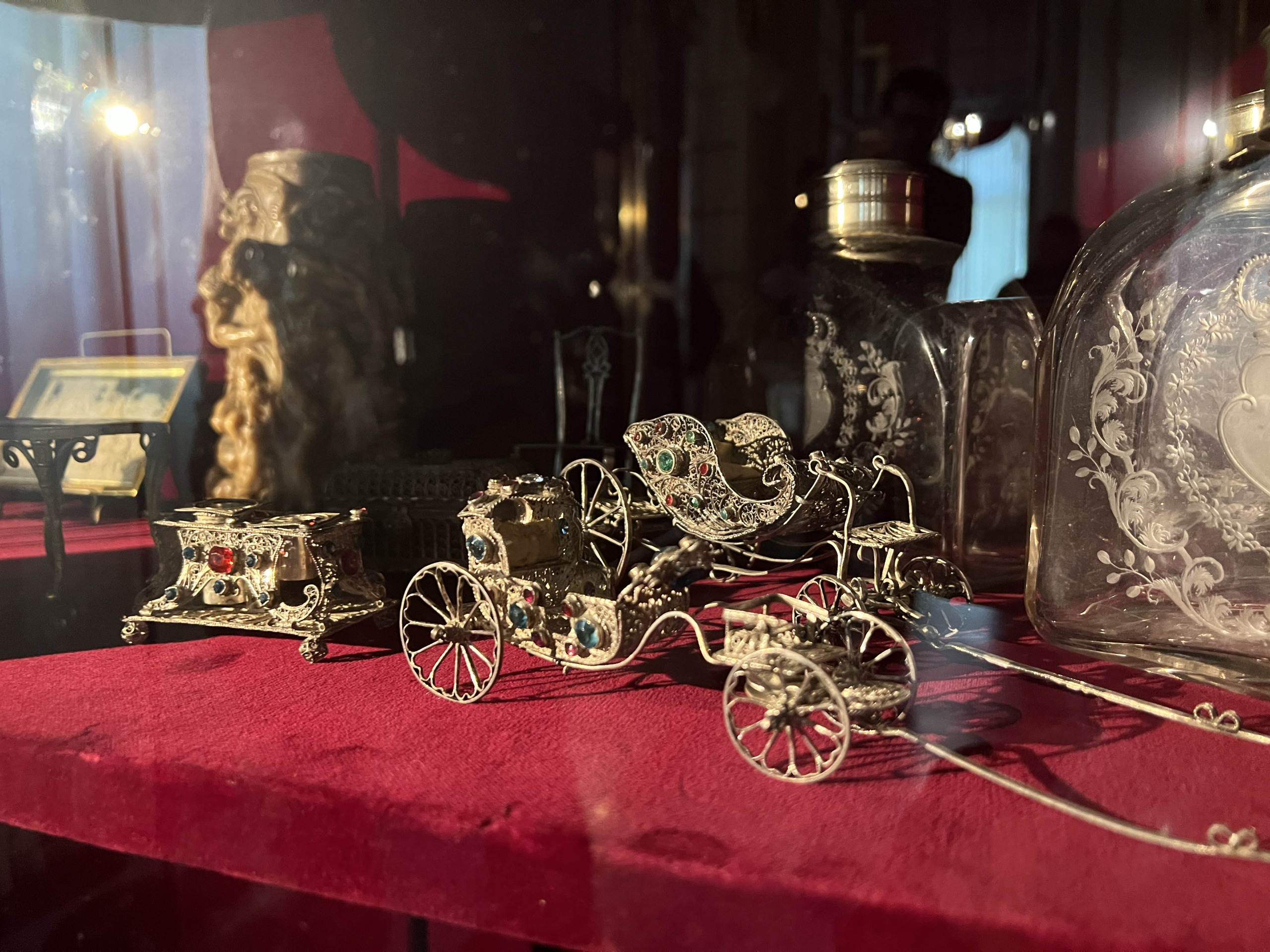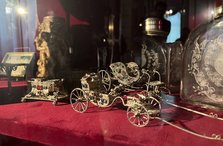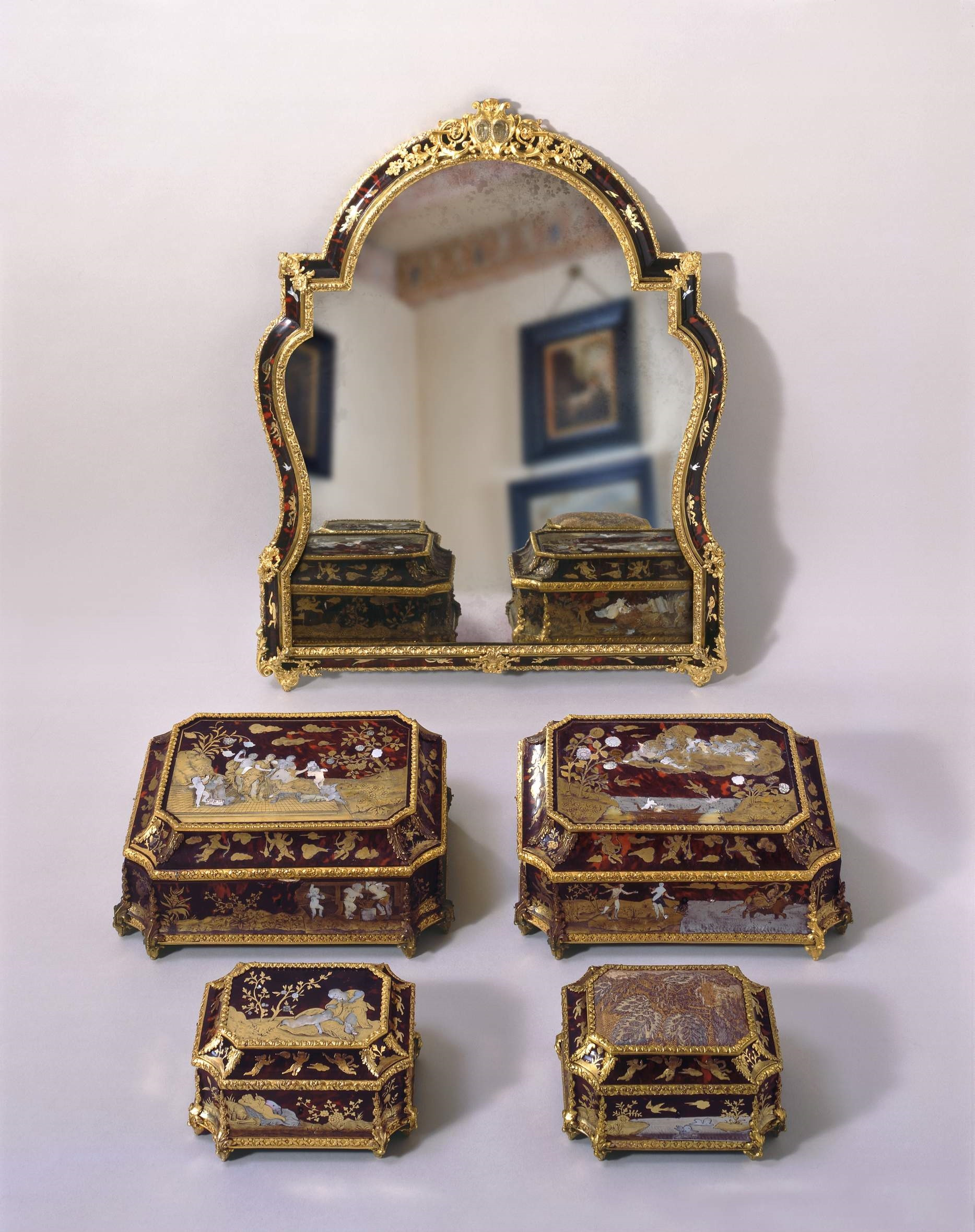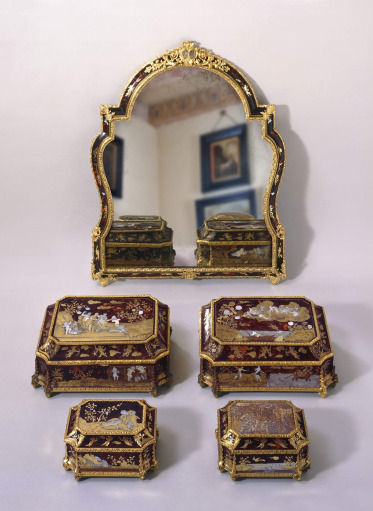 Maria Kazimiera's toiletry set comprises a mirror and four decorative boxes. These are made of rosewood and decorated with gold inlaid marquetry, one of the most precious goldsmithing techniques. The colourful designs were created from a combination of silver, brass, and mother-of-pearl inlays. According to tradition, the set was the property of the Polish Queen Maria Kazimiera, as may be indicated by her coat of arms visible at the top of the mirror.