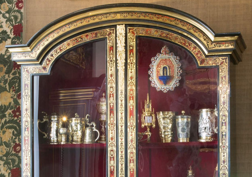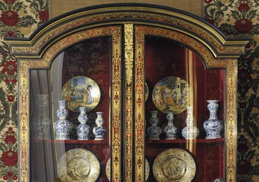The library display cabinets from the Queen's Antechamber date from the era of Louis XIV (1643-1715). They delight viewers with their refined form and graceful proportions. Their decoration is made up of a three-colour inlay, made of black ebony, red tortoise shell and gilded brass.