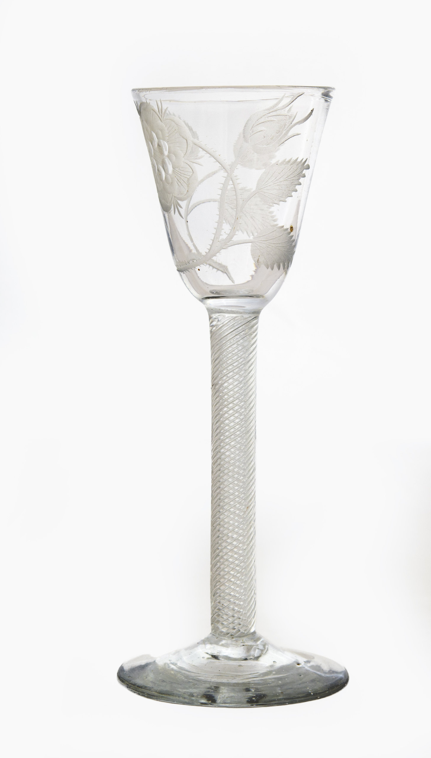 The white rose was an emblem of the Stuarts. Glass with this type of decoration is referred to as Jacobite glass. The white rose in bloom symbolises King James III/VIII, and the rosebud, his eldest son and heir, Prince Charles Edward Stuart.
