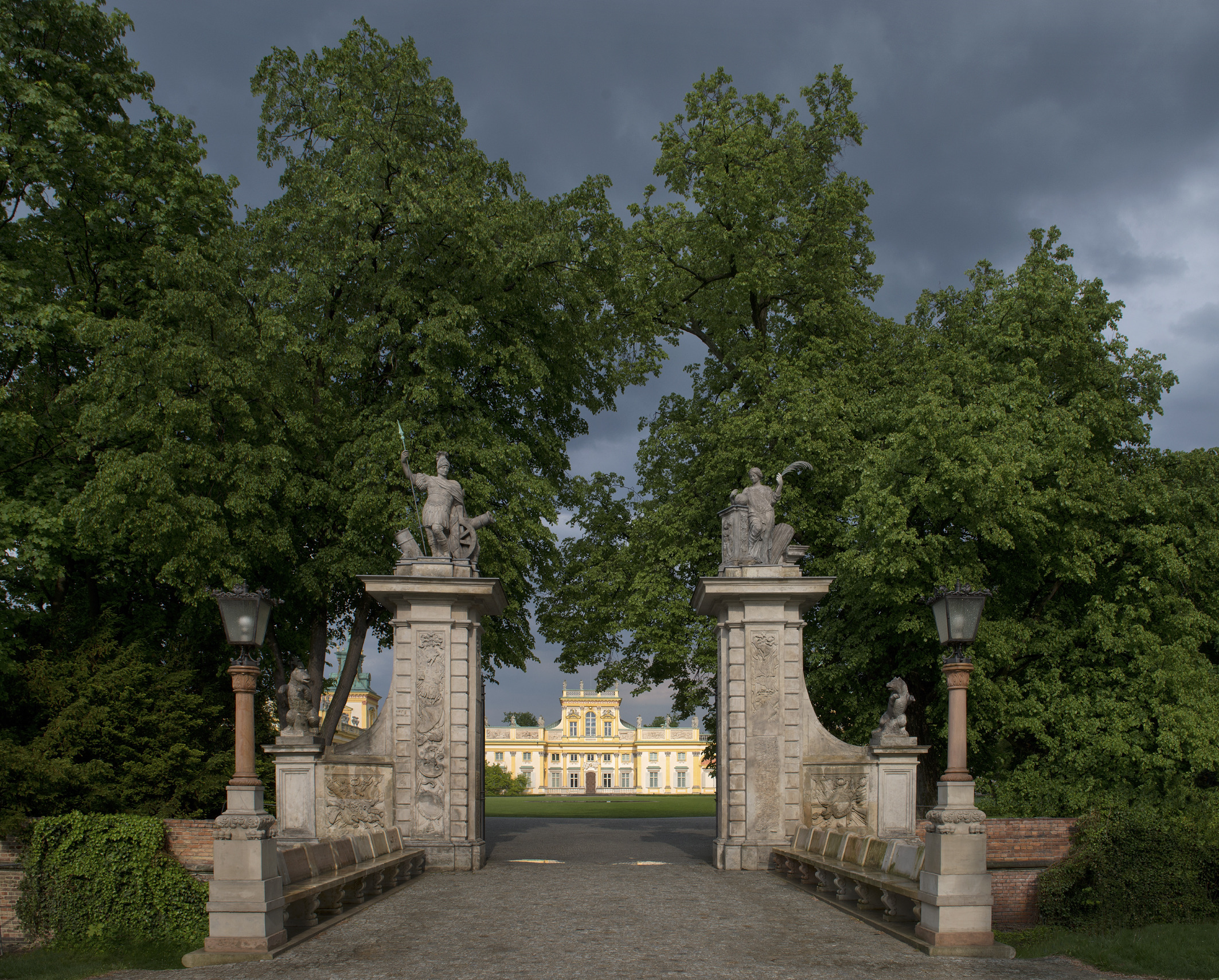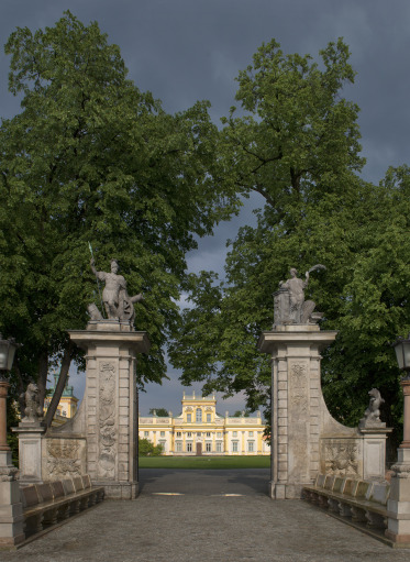 The area in front of the Palace courtyard consists of four quarters surrounded by a brick-ceramic wall and planted with rows of trees. There is a symbolic tomb, the Potocki family mausoleum, a Caretaker's House (currently Museum ticket office), the Lanci House, and Szenicówka (currently Villa Intrata). The courtyard is preceded by a moat with a brick wall and a Baroque gate with stone figures of Mars and Venus, symbolising war and victory.