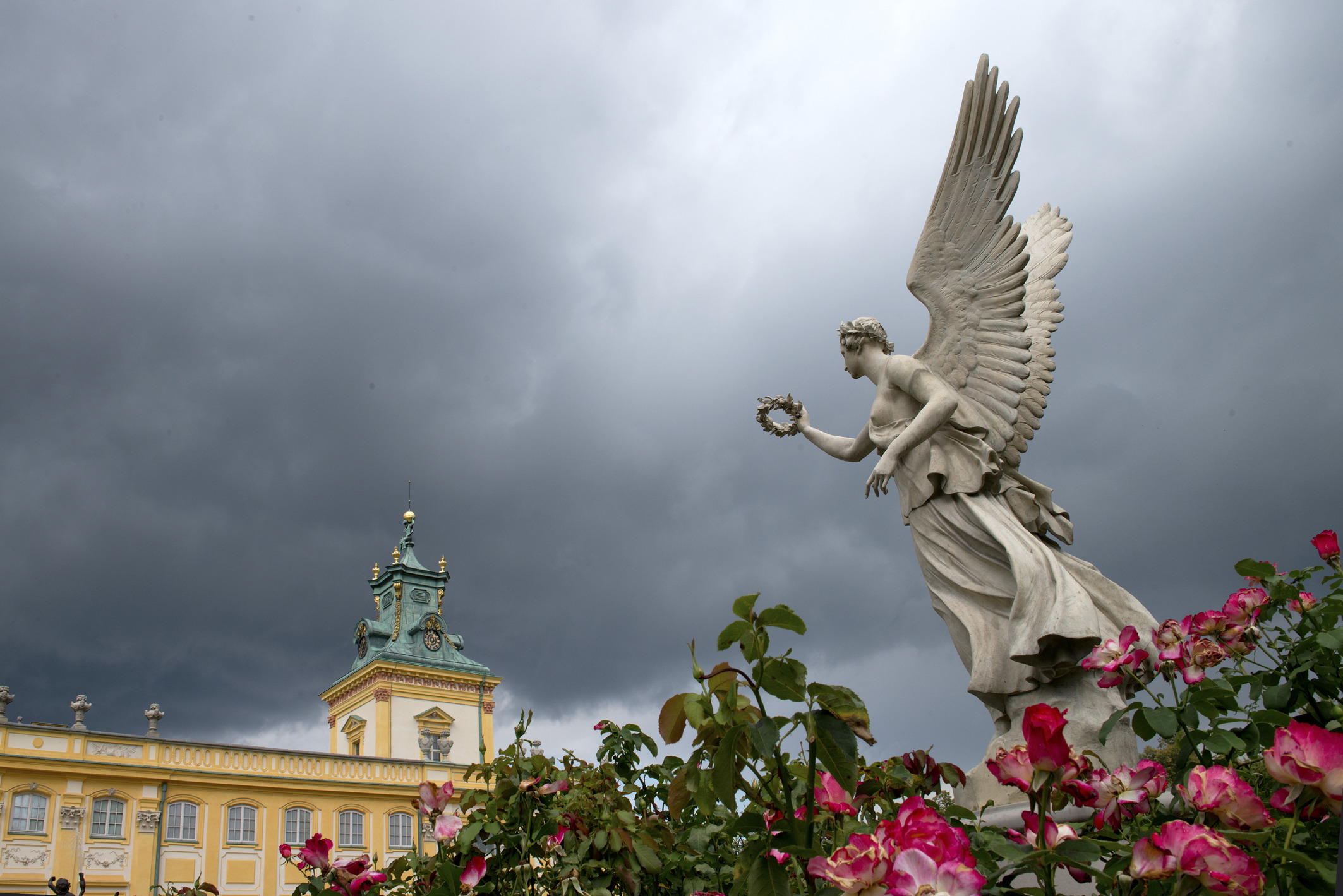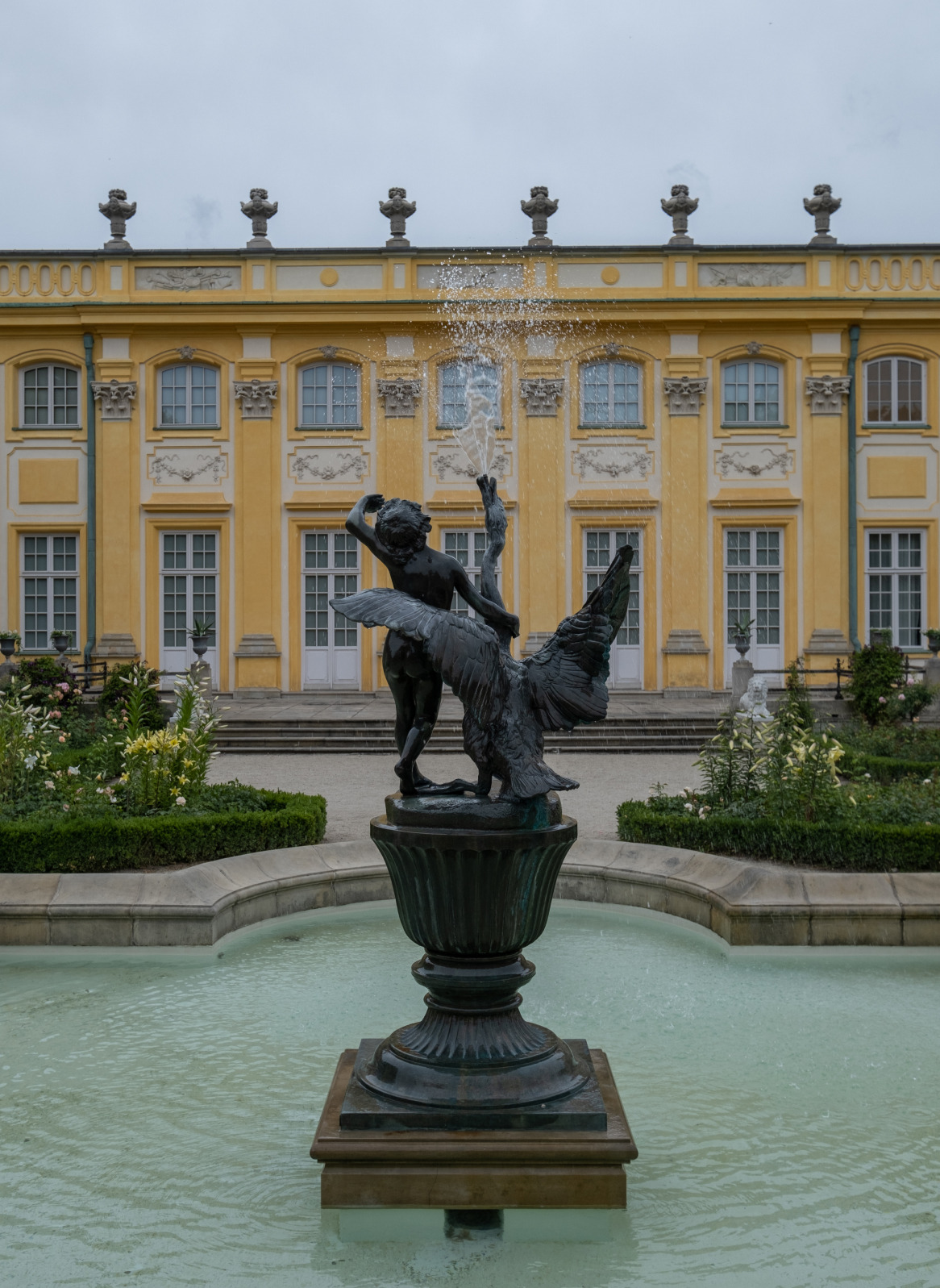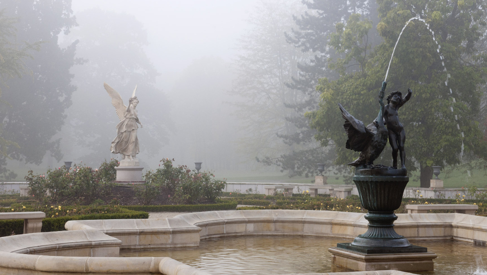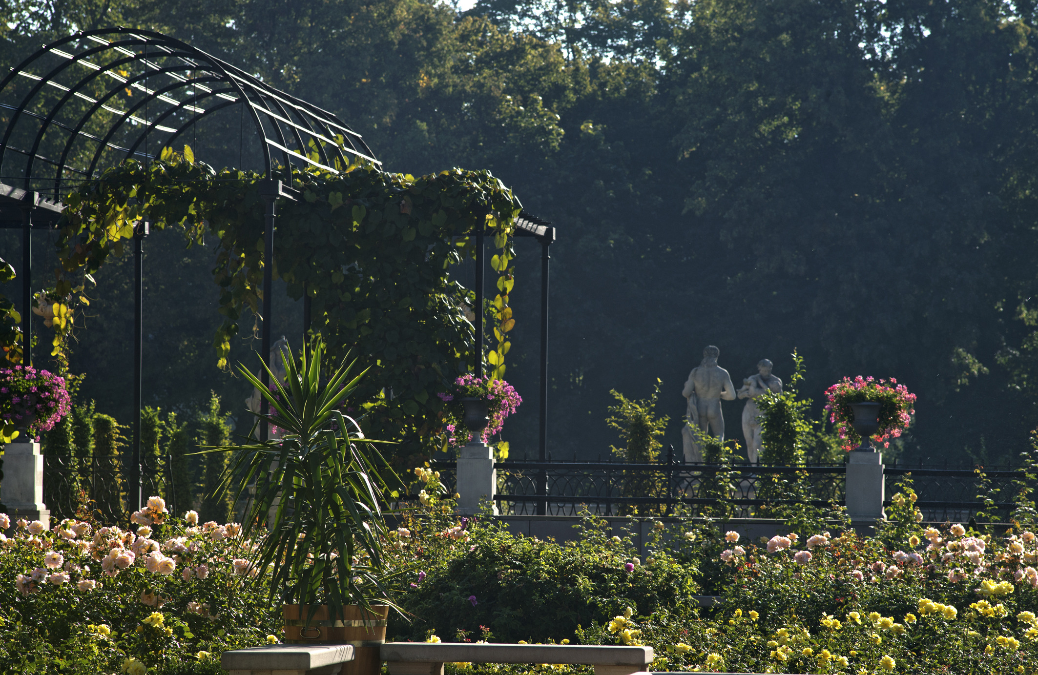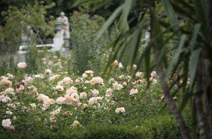 An intimate garden filled with historic varieties of English and French roses, in warm pastel shades. The sculptured decor comprises a ceramic statue of Victory and four allegorical sculptures, Harmony, Beekeeping, Farming and Fishing, crowning the pillars of the gate to the South Landscape Park as well as a centrally located fountain topped with a figure of a boy with a swan.