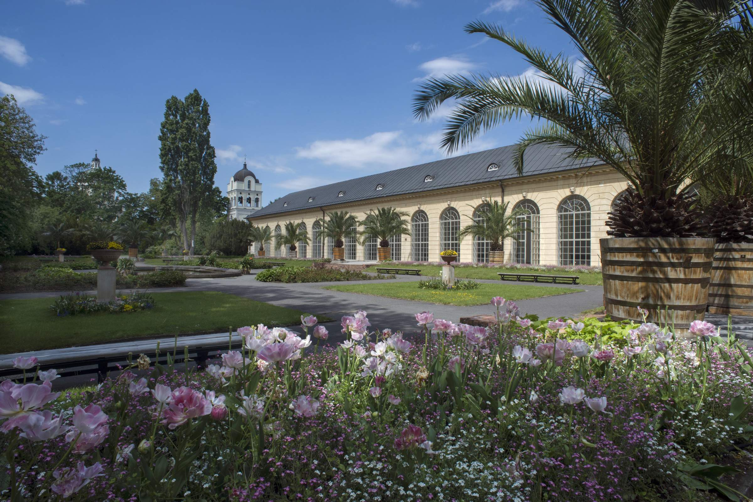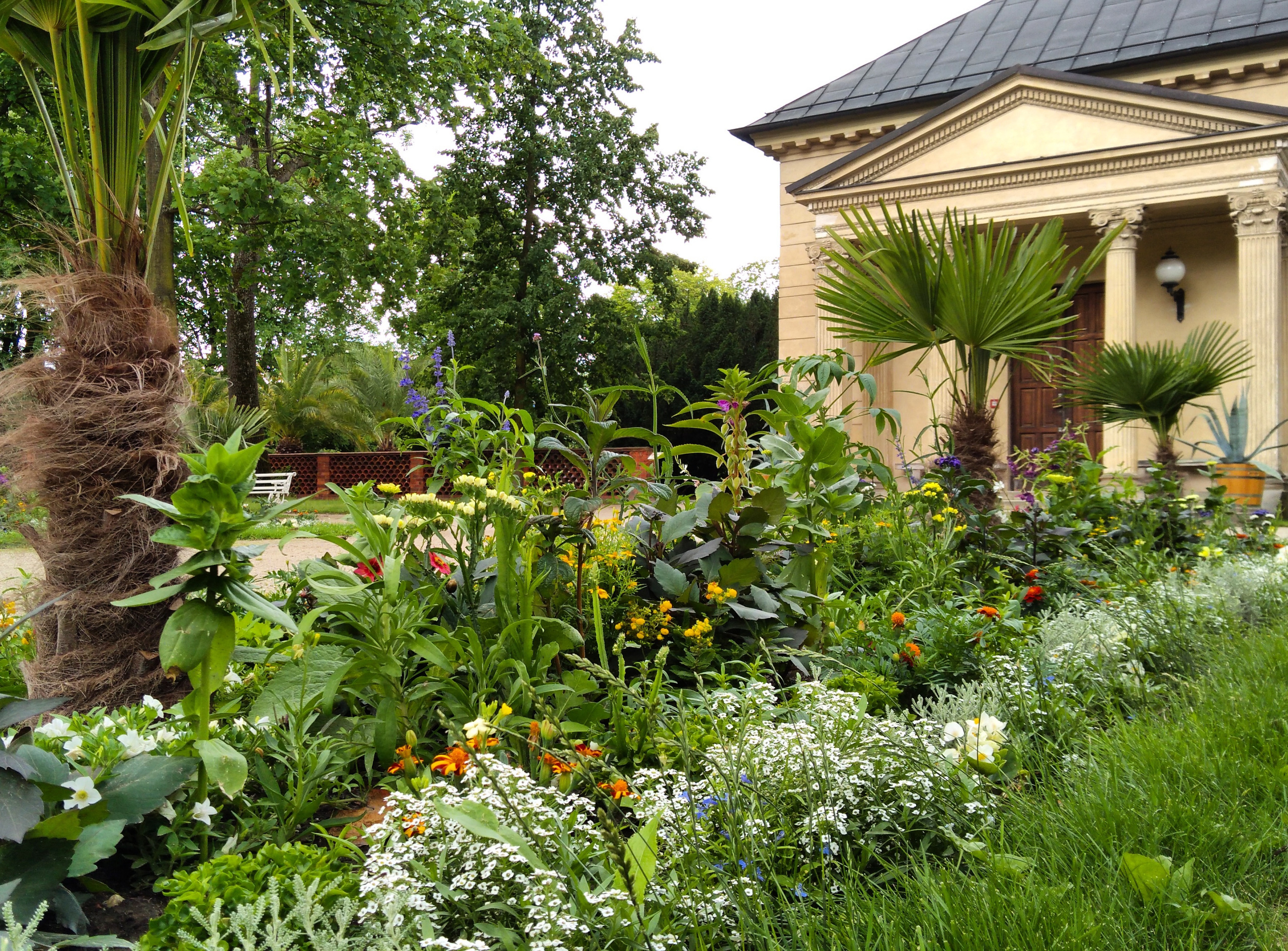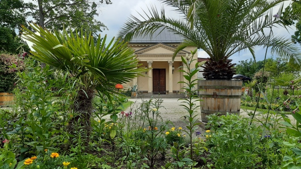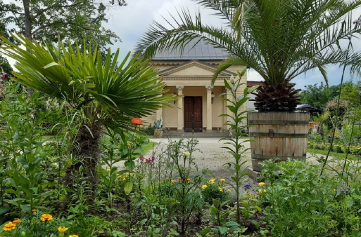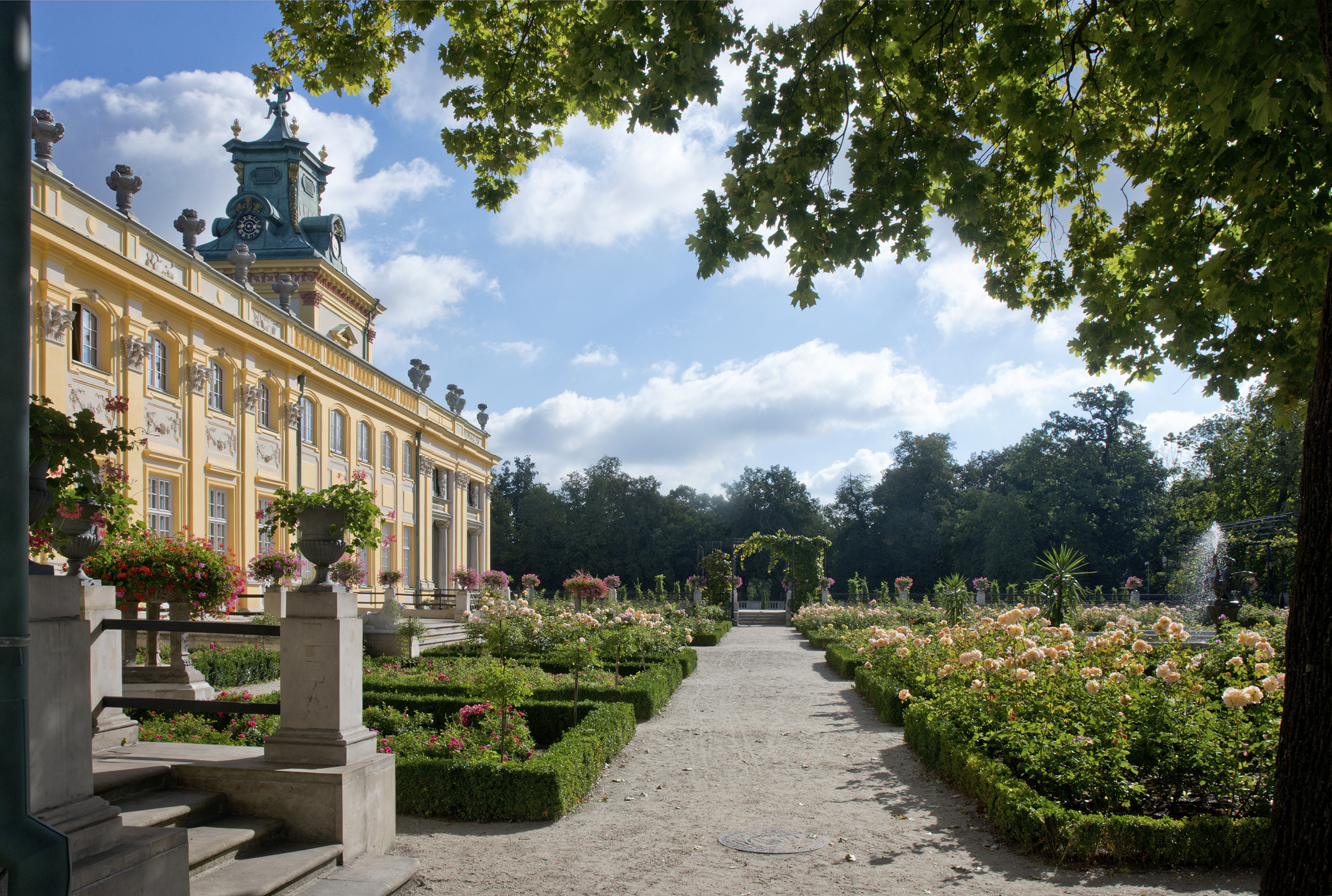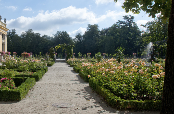 This is the youngest part of Wilanów. During the reign of King Jan III, there was a wooden church and a cemetery here. The quarters adjacent to the Orangery were planted with red roses and hostas. The space around was decorated with exotic plants in pots, which are brought here every summer, such as Canary date trees, Howea forsteriana palms, bananas, and figs.