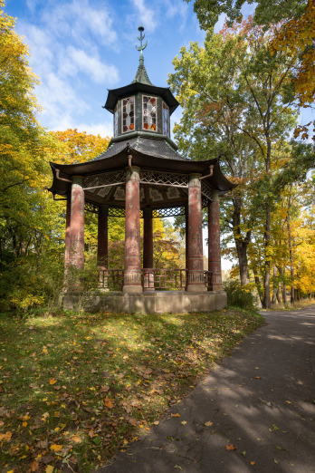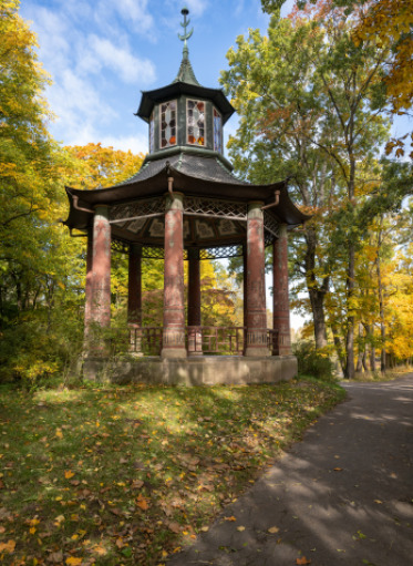 The buildings of the North Landscape Park, built in different styles, were intended to transport guests to distant times and places, such as the Pump Room reminiscent of a medieval castle, the Chinese Gazebo, or the Roman Bridge and the Battle of Raszyń Monument, which imitate ancient architecture, situated on the artificially formed North Island. The buildings, composed in the greenery of the garden, give the whole a romantic aura.