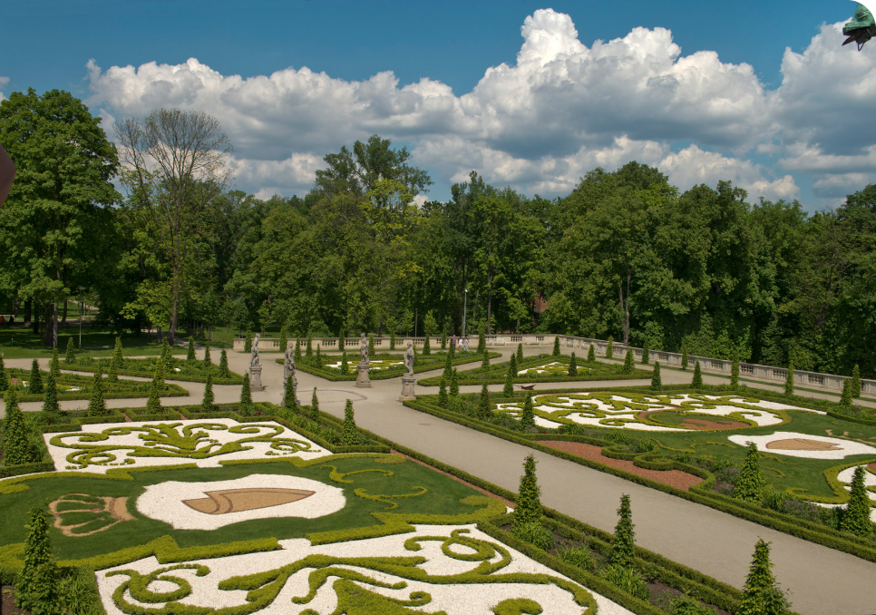 A regular layout of quarters is surrounded by low hedges of beech, filled in with lawns, conical yews, and flowers. The central point of the garden is a fountain topped with a figure of the mythical young Triton. In the western part of the garden is the Grove of Akademos, a place for rest and reflection. Behind the statues of Jan Kochanowski and Franciszek Karpiński, poets celebrating the charms of village life, there is an oval square surrounded by a semicircular stone bench, drawing from "whisper benches" for its shape.