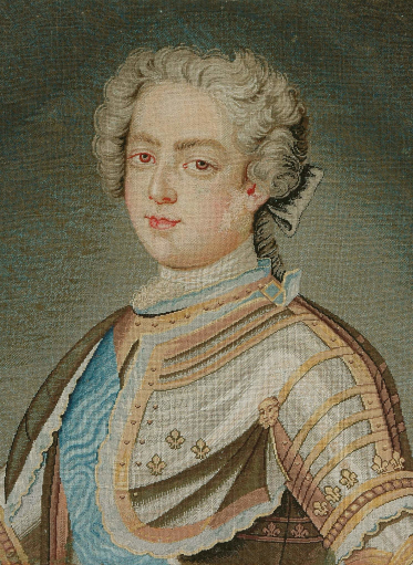 Choć Ludwik ma okrągłą, nieco pulchną twarz i pełne różowe usta, w spojrzeniu jego ciemnych oczu nie ma nic łagodnego. Wzrok władcy tchnie pewnością siebie, wyraz jego twarzy jest arogancki, może nawet wyzywający. Wrażenie to potęguje prosta linia nosa i ostre łuki brwi, wyraźnie ciemniejszych niż pudrowana peruka monarchy. Opadające na plecy, ciasno skręcone loki peruki spięte są na karku szarą wstążką zawiązaną w dużą kokardę.