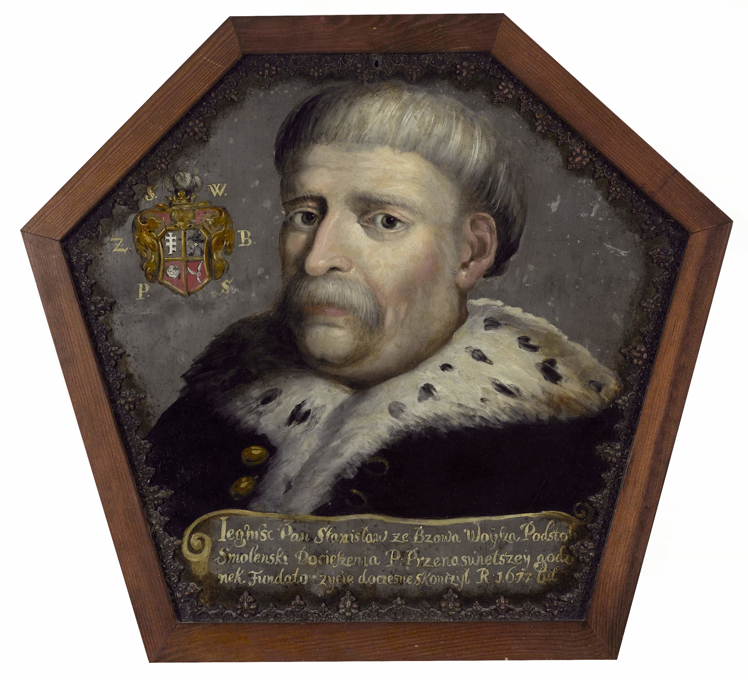 Na dole popiersia napis na srebrnej wstędze obwiedzionej złotem głosi: „Iegomość Pan Stanisław ze Bzowa Woysza Podstoli Smoleński Pocieszenia P. Przenajświętszey godzinek Fundator – życie doczesne skończył R. 1677”.