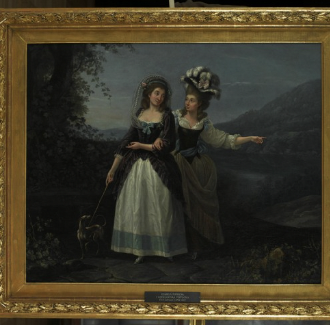 Portret utrzymany jest w chłodnych, jakby przydymionych barwach. Przeważają szarości i błękity. Siostry Potockie przechadzają się kamienną ścieżką wiodącą między tonącymi w cieniu drzewami. Szlachcianki idą obok siebie. Trzymają się pod ramię. Wydają się pogrążone w rozmowie – ich twarze zwrócone są do siebie, a idąca nieco z tyłu i po prawej Izabela wyciąga lewą rękę i wskazuje coś Aleksandrze. Towarzyszy im mały piesek o krótkiej, brązowej sierści i zakręconym ogonku, którego Aleksandra trzyma na smyczy. W tle rozciąga się panorama jeziora: stalowa tafla wody, za którą w oddali wznosi się porośnięty drzewami pagórek nieco tylko ciemniejszy od nieba zasnutego szaroniebieskimi chmurami.