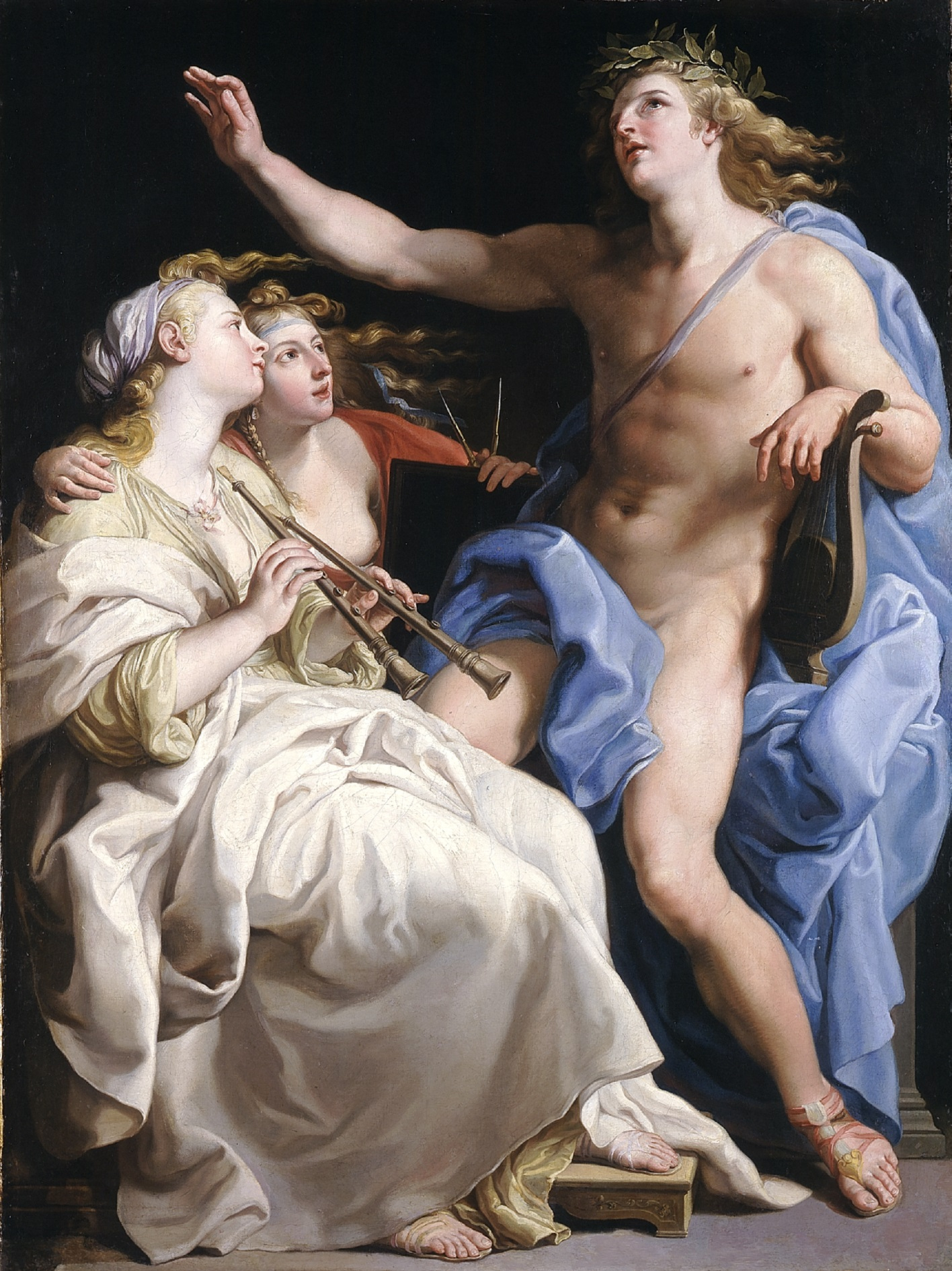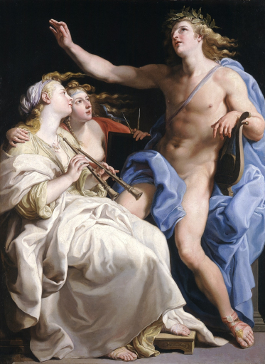 Obraz przedstawiający boga Apolla i dwie wpatrzone w niego muzy powstał po 1741 roku w pracowni Pompea Girolama Batoniego. Wykonano go techniką oleju na płótnie. Mierzy 122 centymetry w pionie i 90 centymetrów w poziomie.