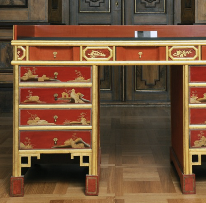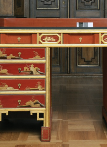 Do wyposażenia biurka, na życzenie Potockiego, wykorzystano szuflady z XVIII-wiecznej sekretery z warsztatu Martina Schnella, wykonanej dla Augusta II Mocnego. Biurko miało zapewne stanowić wyposażenie nieistniejącego już Apartamentu Chińskiego, w którym Potocki, wielbiciel i kolekcjoner sztuki Dalekiego Wschodu, eksponował swoje bogate zbiory.