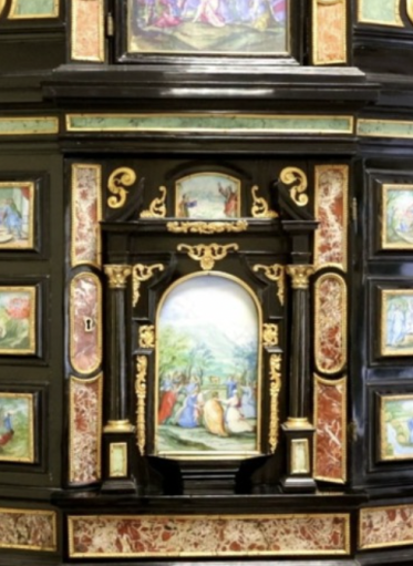 Dekorację wewnętrznej strony drzwiczek stanowią malowane złotą farbą kwiaty, kłosy zboża i „trawy jesienne”, charakterystyczne dla warsztatu Schnella . Powierzchnię szufladek zdobią wykonane w lace drobne motywy krajobrazowe, ptactwo domowe oraz postacie ludzkie. Wszystkie przedstawienia mają niewielkie rozmiary i są bardzo szczegółowe. Tworzą wysmakowane, nieco ascetyczne kompozycje, jakby wyrastające z krawędzi podłużnych, wąskich szuflad.
