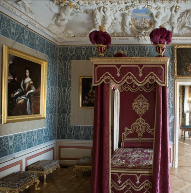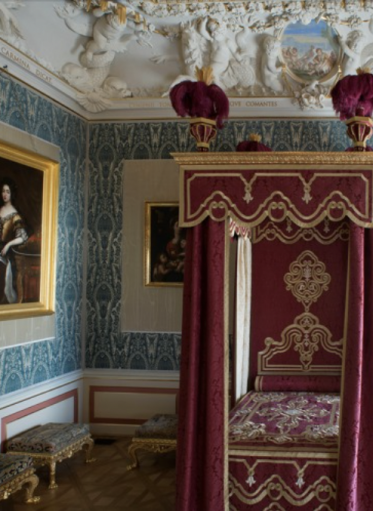 Zgodnie z ceremoniałem dworskim łoże paradne wystawione było na widok publiczny. Stąd jego bogate zdobienie i oprawa architektoniczna.