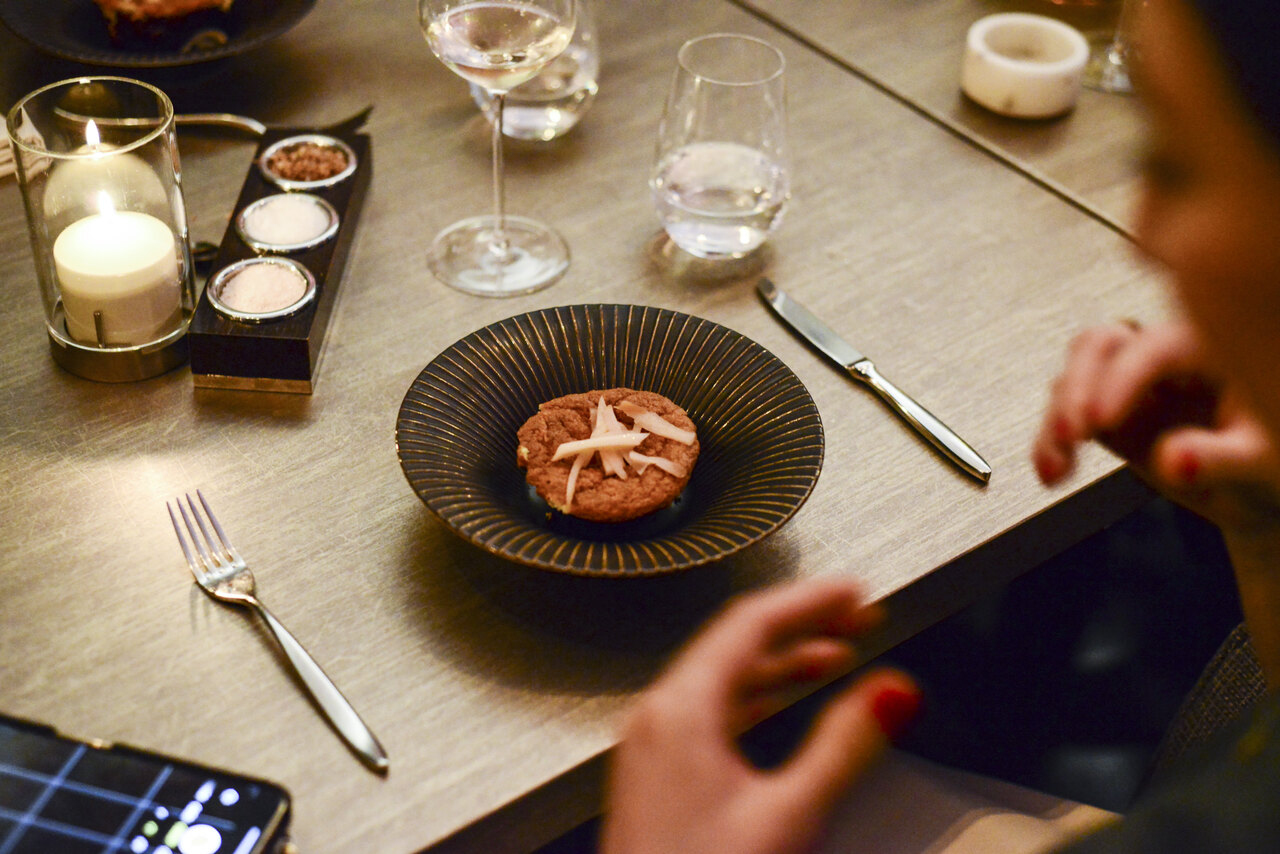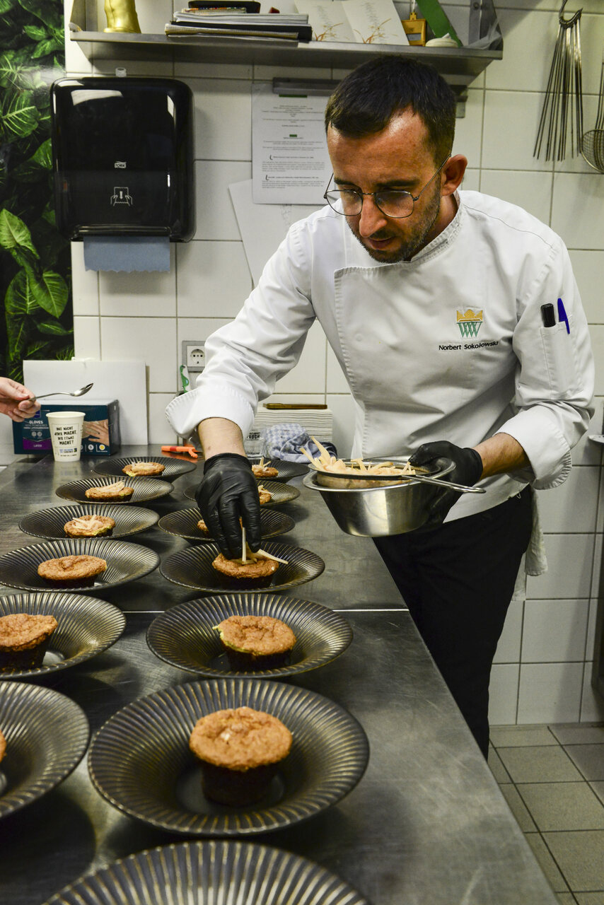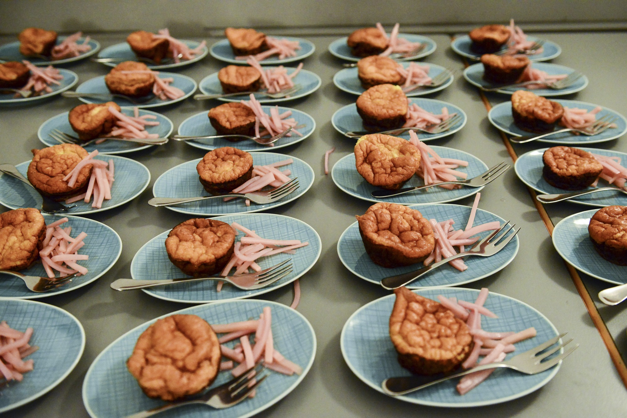 Na stole leżą talerze, na których położono danie w formie babeczki i widelczyk.