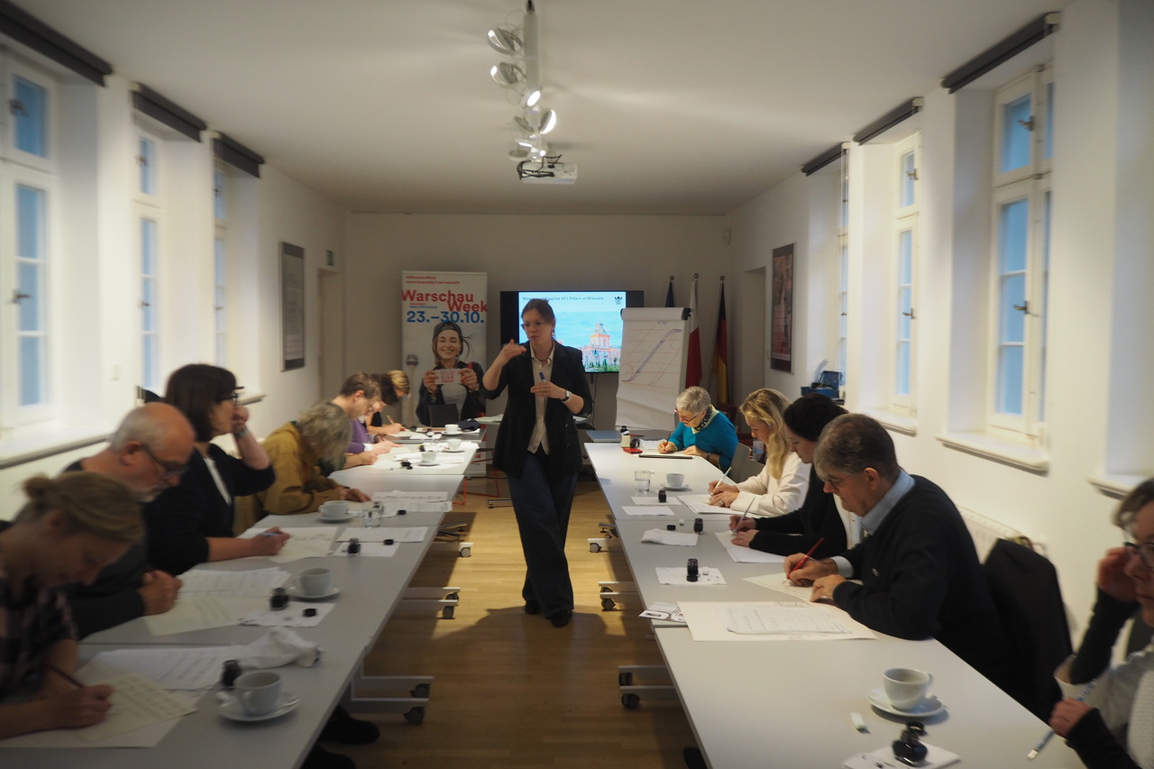 Mężczyzna uczy dwie kobiety kaligrafii - odręcznego pięknego pisma. Młoda kobieta stojąca w centrum wyjaśnia zagadnienie z kaligrafii grupie osób usadzonych przy stołach po dwóch stronach. Kartka papieru z odręcznie napisanym tekstem na której leży stalówka. Małe białe talerzyki na których jest danie. Czworo ludzi w kuchni w trakcie przygotowywania posiłku. Dwie osoby w centrum - mężczyzna i kobieta rozmawiają. Ozdobne tanie na talerzu. Obok na stole są sztućce, świeczki, szklanka i kieliszek. Mężczyzna w fartuchu (kucharz) w trakcie przygotowywania potraw ustawionych w takich samych talerzach. Grupa ludzi pozuje do zdjęcia przed budynkiem z kolumienkami. Grupa osób siedzi przy stole i jest w trakcie spotkania. Na ścianie widnieje prezentacja, o której opowiada jeden z uczestników.