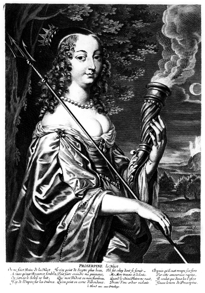 Zanim została w wieku 34 lat drugą małżonką polskiego króla Władysława IV, umiała należycie zadbać o własną reklamę, zamawiając w Paryżu swoje wizerunki malowane i rytowane. Wśród tych ostatnich, obok mistrzowskiego miedziorytu Claude’a Mellana z 1645 r., zasługują na uwagę ryciny gdańszczanina Jeremiasa Falcka (ok. 1610 – 1677) z wczesnego, paryskiego okresu (1639 – 1646) twórczości artysty. Są to cykle miedziorytów o treści alegorycznej, mitologicznej i symbolicznej, jak np. Cztery Pory Roku, Cztery Pory Dnia czy Dwanaście Miesięcy, wydawane u Jeana Leblonda. Podobno wszystkim występującym tam postaciom kobiecym grafik nadał rysy księżniczki Marii, co dowodziło, iż prezentowała ona modny wzorzec ówczesnej piękności. Mamy więc tu do czynienia z tzw. kryptoportretem, inaczej mówiąc portretem ukrytym. I tak jest właśnie w przypadku miedziorytu z cyklu Cztery Pory Dnia, przedstawiającego wizerunek rzymskiej bogini Prozerpiny, a zarazem personifikacji Nocy (pozostałe sztychy wyobrażają: Aurorę – Poranek, Wenus – Południe i Dianę – Wieczór). Urzekająca urodą Prozerpina, mityczna władczyni mrocznego Tartaru, niewiele ma jednak wspólnego z antykiem. Ubrana – zgodnie z XVII- wieczną modą francuską – nosi dekoltowaną atłasową suknię. Szyję otacza sznur wielkich pereł. Zwracają uwagę ręce – o pięknym rysunku, wykwintnym ruchem trzymające trójząb oraz pochodnię w kształcie rogu obfitości. Ważny jest także, widoczny w tle sztychu, wymarły, oświetlony księżycem nocny pejzaż (nokturn) z wejściem do Królestwa Cieni, zaznaczonym buchającymi płomieniami. Miedzioryt Falcka, wirtuozowsko prowadzony samym rylcem, odpowiadał gustom ówczesnych francuskich odbiorców. Tym bardziej więc należy żałować, iż autor pierwowzorów malarskich bądź rysunkowych do wspomnianych serii graficznych pozostaje dotąd nieznany.