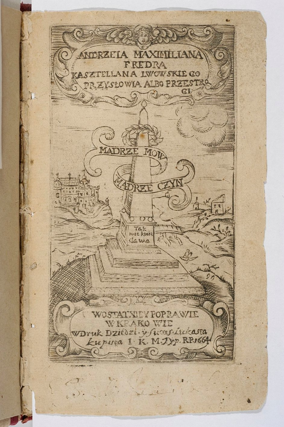 Najbardziej znanym dziełem Fredry, które znalazło się oczywiście w bibliotece królewskiej Jana III, są Przysłowia mów potocznych, albo przestrogi obyczajowe, radne, wojenne, wydawane trzykrotnie w XVII w. w Krakowie (1658, 1659, 1664). Wbrew tytułowi, książka jest zbiorem nie tylko przysłów, lecz także aforyzmów i sentencji. Autor (nota bene używający również pseudonimu Błażej Lipowski), znany skądinąd dyplomata, cieszący się poważaniem wśród szlachty ziem ruskich, którą często reprezentował, stworzył własny program naprawy Rzeczpospolitej. Swoje konserwatywne przekonania republikańskie łączył z postępowymi projektami organizacji przemysłowej samowystarczalności państwa, opartej o miasta i mieszczaństwo, którym pragnął przywrócić należne im miejsce. Uważając, iż powinien to być republikanizm oświecony, Fredro wiele uwagi poświęcił projektowanym reformom w systemie edukacji: przewidywał kształcenie nie tylko w szkole, lecz także w domu – i to w odniesieniu zarówno do szlachty, jak i mieszczan. Jako nieliczny propagował konieczność kształcenia dziewcząt, i to w szerokim stopniu, nie tylko w zakresie umiejętności praktycznych. Uważał za konieczne zakładanie bibliotek publicznych, szerzenie czytelnictwa i kształcenie rzemieślników. W Przysłowiach zawarł również swoje refleksje o ludziach, o życiu i o rządzie. Fredro, zwany polskim La Rochefoucauld ( z uwagi na swoje inne dzieło – Monita politico – moralia, 1664, szczególnie popularne za granicą), był najbardziej europejskim pisarzem w polskiej literaturze 2. połowy XVII w.