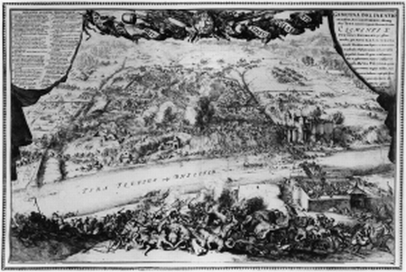 Istnieje wiele rycin uwieczniających tę batalię, ale do najwspanialszych dzieł graficznych należy niewątpliwie miedzioryt Romeyna de Hooghe’a (1645 – 1708), holenderskiego rytownika pracującego czasowo dla Jana Sobieskiego. W bogatym dorobku tego sztycharza, liczącym ponad tysiąc prac, znalazło się w sumie 20 poloników wykonanych w latach 1674 – 1685 ; dotyczą one niemal wyłącznie wspomnianego monarchy. Zatrudnienie Holendra nastąpiło za pośrednictwem Grattów – ojca i syna noszących to samo imię Franciszek, silnie związanych z osobą Sobieskiego. Gratta senior utrzymywał ożywione kontakty handlowe i polityczne z Holandią. Gratta junior (zm. ok. 1690) uczestniczył jako żołnierz w wyprawach wojennych Sobieskiego, podczas których na miejscu sporządzał rysunki, służące potem jako wzory do miedziorytów Hooghe’a. Właśnie Grattowie wystąpili z inicjatywą upamiętnienia objęcia tronu przez Sobieskiego poprzez wydanie cyklu rycin, przedstawiających jego dotychczasowe zasługi, wykorzystując tu autentyczny materiał rysunkowy.