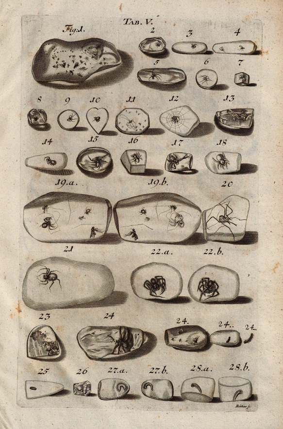 W pierwszej i drugiej części Historia succinorum… doktor Sendel przedstawił uczonym czytelnikom swojej książeczki drezdeńskie bursztyny, które kryły w swoim wnętrzu owady: latające i biegające. Doktor opisywał zatem ładne bryłki, które zawierały pszczoły i osy, twierdząc, że te z pszczołami to pewnie fałszywki. Wskazywał na wspaniałe egzemplarze z czteroskrzydłymi muchami, muchówkami i muszkami-owocówkami, nazywanymi niekiedy „octówki”. Zadawał także ciekawe pytanie, czemu w bursztynach ciemnych rzadko kiedy zachowały się jakieś zwierzątka – i snuł różne hipotezy na ten temat.
