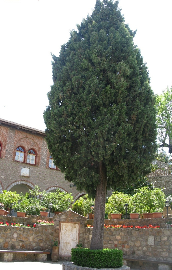 Kolorowe, współczesne zdjęcie. Przedstawia drzewo cyprys. Za drzewem kamienny mur na którym ustawione są donice z zielonymi roślinami. Dalej niska budowla murowana z podcieniami.