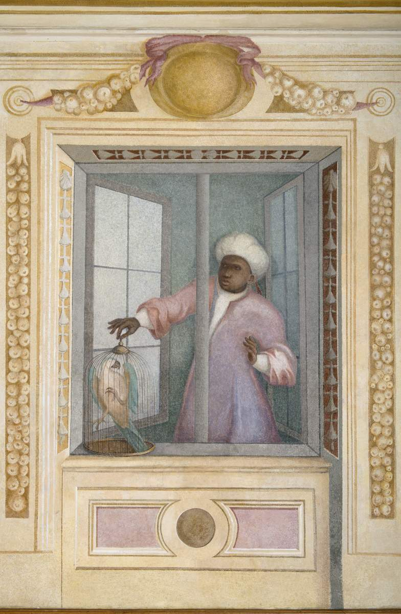 Grafika przedstawia altanę w której zgromadzone są zwierzęta. Przed drzwiami altany stoją dwa strusie, spacerują lamparty i lew. Z boku patrzą na nich ludzie. Jest to menażeria, gdzie dzikie zwierzęta zgromadzone w celu pokazywania ich publiczności.