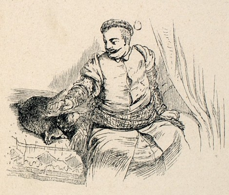 Grafika przedstawia wąsatego mężczyznę w żupanie, siedzącego na łóżku i bawiącego się ze zwierzakiem, prawdopodobnie psem.
