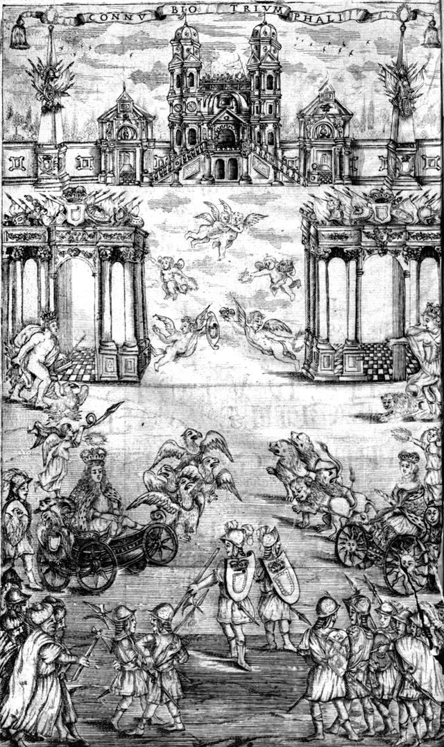 W rękopisie Zaleskiego znajduje sie przedstawienie całostronicowe, które uznać można za odtworzenie głównej sceny theatrum. Ukazuje antykizowane wyobrażenie kobiety i mężczyzny, odpowiedników nowożeńców, zasiadających na rydwanie ze splecionymi dłońmi. Powóz, zaprzężony w dwa orły i dwa lwy powozi symbolizujący ich miłość Amor. Nad rydwanem unosi się orzeł trzymający w szponach tarczę Janiny i palmy (znak zwycięstwa), w dziobie zaś koronę. W tle sceny widoczna jest świątynia posadowiona na skale oraz nieokreślona budowla antyczna – typowy antykizowany pejzaż. W kompozycji tej zwraca szczególną uwagę kłaniająca się małżonkom Sobieskim, z płonącym sercem w dłoni (znak afektu), personifikacja Krakowa (Cracovia). Identyfikuje ją zgodnie z tradycją tego typu wyobrażeń herbowa chorągiew miasta spoczywająca hołdowniczo na ziemi. Można przypuszczać, iż scenie towarzyszyła w dekoracji znana z przekazu inskrypcja, podkreślająca dynastyczną i polityczną wymowę ślubu dzieci królewskiej krwi: Sacro Augusti Sangvinis Faederi, | Regum Nuptiis, et Auspitiis,| Cracodunum Sarmatiae,| Votum, cultus, officia („Kraków sarmacki składa życzenia, cześć i obowiązki świętemu przymierzu czcigodnej krwi, zaślubinom królów i dowodzących”).