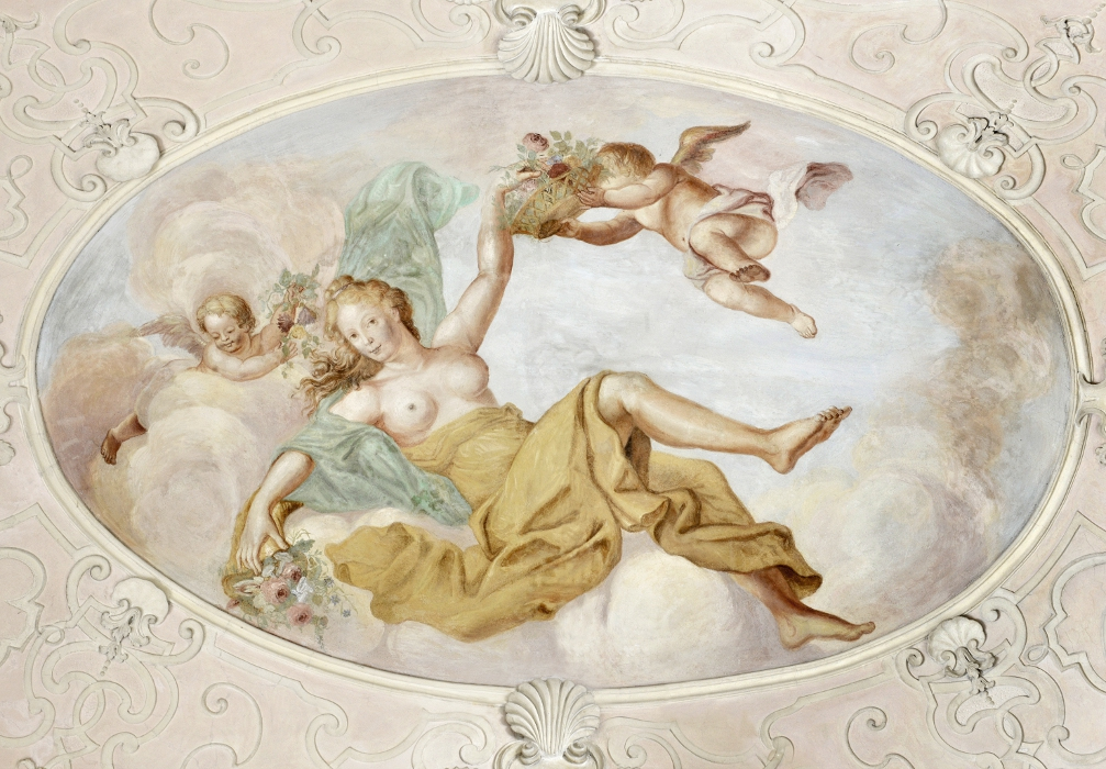 Fresk na ścianie. Przedstawia młodą kobietę z odsłoniętymi piersiami, leżącą w chmurach. Po prawej stronie mały amor podaje jej kosz z kwiatami, po lewej stronie zza chmur wygląda aniołek, trzymający kwiaty. Jest to portret Elżbiety Sieniawskiej jako Flory. Fresk znajduje się w Sieni Dolnej pałacu w Wilanowie.