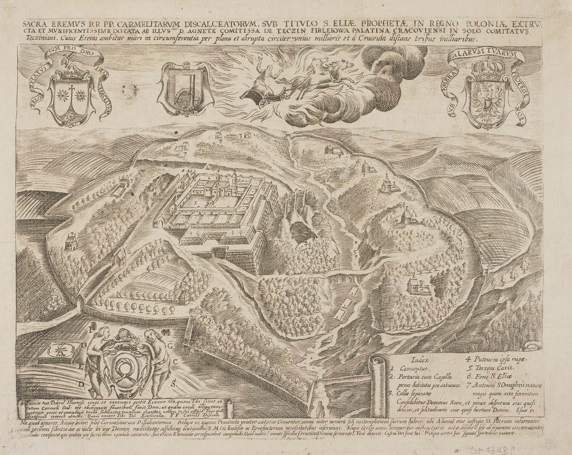 Wkrótce po powstaniu samodzielnej prowincji polscy karmelici bosi rozpoczęli starania o założenie eremu. 20 VI 1620 zezwoliło im na to Definitorium Generalne w Rzymie. Nie było to proste, zakon bowiem nie dysponował wystarczająco zasobnymi funduszami własnymi. W 1625 karmelici pozyskali dla swej sprawy Agnieszkę z Tęczyńskich Firlejową, która obiecała ufundować erem w swych dobrach. Upoważniła zakonników do wyszukania miejsca, które będzie odpowiadać wymogom reguły. Początkowo zakonnicy wybrali las siedlecki, by ostatecznie ulokować erem na górze w Czernej należącej do Jana Tęczyńskiego. Po zamianie dóbr, 4 IV 1630 Tęczyński oficjalnie przekazał zakonnikom stok góry czerneńskiej. 10 V 1631 Agnieszka Firlejowa wystawiła dokument erekcyjny eremu pw. św. Eliasza. 28 IX 1633 zakonnicy wprowadzili się do częściowo wybudowanego klasztoru. W latach 1635–1637 na zachód od klasztoru zbudowano eremitaże: św. Jana Chrzciciela i Wniebowzięcia Najświętszej Maryi Panny. Na południe od klasztoru, blisko murów zewnętrznych otaczających całe założenie, sięgające daleko na północ od klasztoru i obejmujące zachodnią część sąsiedniej góry siedleckiej, usytuowano eremitaż św. Agnieszki. W obrębie murów zewnętrznych tzw. wielkiej klauzury papieskiej znajdowały się mury małej klauzury, otaczające sam klasztor oraz ujmujące drogi dojazdowe do niego od południa, a później (gdy przy moście w dolinie wybudowano nową furtę) od wschodu, od bramy na szczycie góry siedleckiej. 21 IX 1640 biskup przemyski Piotr Gembicki poświęcił i konsekrował kościół pw. św. Eliasza Proroka. Stało już wtedy jedno skrzydło klasztoru i brama od północy (z datą: 1640), zamykająca tzw. małą klauzurę. W latach 1644–1651 na podwórzu do północnego zachodu wykuto studnie. Przed 1646 istniał też most, przerzucony nad potokiem w dolinie dzielącej wzgórza czerneńskie i siedleckie, oraz eremitaże rozrzucone po wzgórzach. W 1668 przeprowadzono nową drogę do eremu. W latach 1671–1691 wzniesiono słynny, zachowany w postaci ruiny, most arkadowy z kamiennymi balustradami zakończonymi figurkami świętych. W 1672 zakończono budowę zewnętrznego muru wielkiej klauzury papieskiej o długości 4180 m, ujmującego las o powierzchni 80 ha.