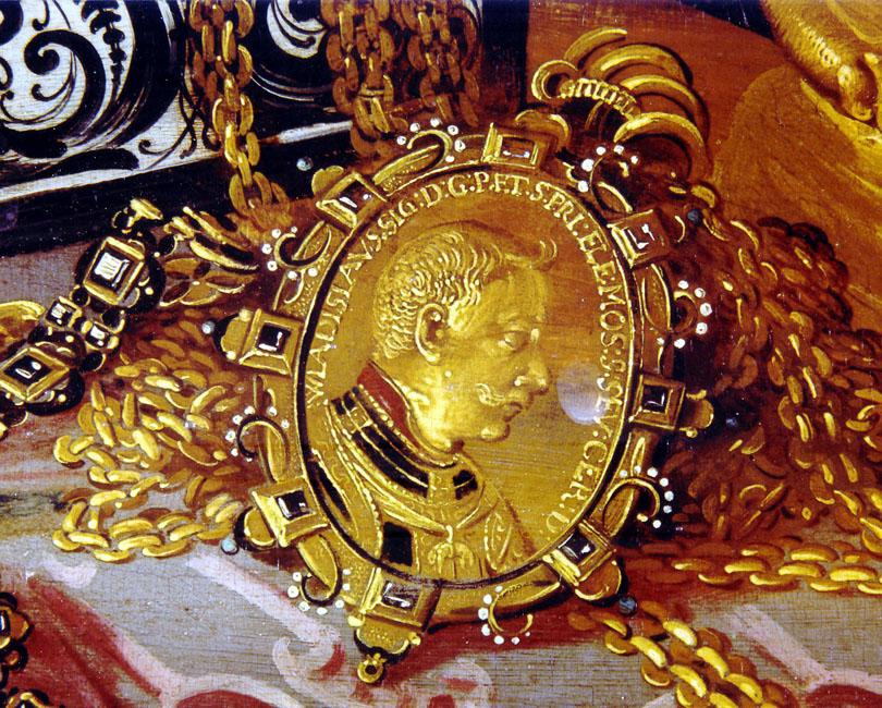 Drugi Waza również wykorzystywał zarówno w dyplomacji, jak i polityce wewnętrznej „złote łańcuchy z twarzy swej obrazem”. Takowy artefakt możemy podziwiać na obrazie Gabinet sztuki królewicza Władysława Zygmunta z Zamku Królewskiego w Warszawie. Marian Gumowski wspominał o 4 tego typu dziełach sztuki przetrwałych do 1939 roku. Naszyjnik z podobizną swoją oraz ojcowską przekazał „Prync” w darze Piotrowi Konaszewiczowi Sahajdacznemu, jako nagrodę-pamiątkę bitwy chocimskiej 1621 roku. Przed wyjazdem polskiego orszaku z Brukseli urzędnicy infantki Izabeli Klary Eugenii otrzymali na pamiątkę „złote naszyjniki z portretem Najjaśn. Królewicza”. Podobny upominek już jako król wręczył ambasadorom moskiewskim w 1635 r. oraz członkom ambasady weneckiej w 1637 r. “Popiersie” z wizerunkiem ojca król-elekt złożył na ręce Stanisławowa Radziejowskiego 23 listopada 1632 r. Notabene, kilka portretów drugiego Wazy przedstawia go z owalnym medalionem o nieczytelnym przesłaniu, zawieszonym na piersi (np. wizerunek z Tytularza Moskiewskiego) lub na łańcuchu przerzuconym przez ramię (np. malowidło stropowe z Podhorzec).