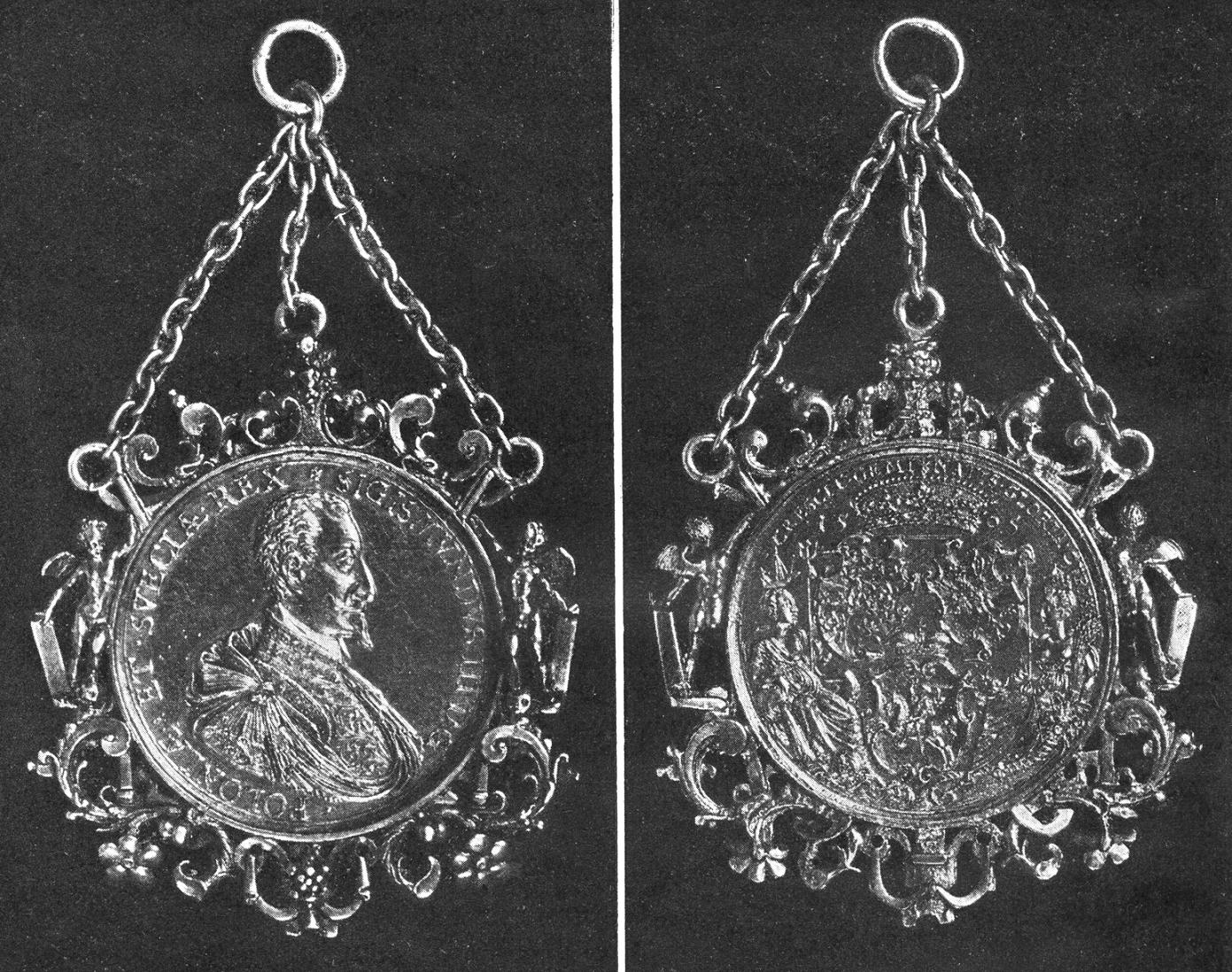 Zygmunt III osobiście wykonywał „bardzo sposobnie wizerunki własne na kamieniach drogich rżnięte, które zawieszone na kosztownych łańcuchach złotych, takoż jego roboty, rozdawał znakomitym a dobrze zasłużonym w kraju mężom”. Jednym z głównych atrybutów królów z dynastii polskich Wazów (do tego stopnia, że nawet ich imaginacyjne wizerunki indywidualizowano właśnie poprzez ten szczegół) był order Złotego Runa (del Tuson de Oro, Velleris Aurei). Jednak ze względu na brak rodzimego odznaczenia, wykorzystywali oni powszechnie medale z własnymi podobiznami, jako wyraz szczególnych zasług, łaskawości i przychylności, chęci zademonstrowania wspaniałomyślności, cnoty liberalitas oraz largesse. Zawieszone na łańcuchach medale suwerenów, oprawione w nierzadko emaliowane i kameryzowane złoto, wręczane jako specjalne wyróżnienie, antycypowały lub zastępowały odznaczenia państwowe. Najczęściej uznaje się, iż ten typ tzw. medali nagrodowych lub podarunkowych rozpowszechnił się w siódmej dekadzie XVI wieku w Tyrolu i Bawarii.