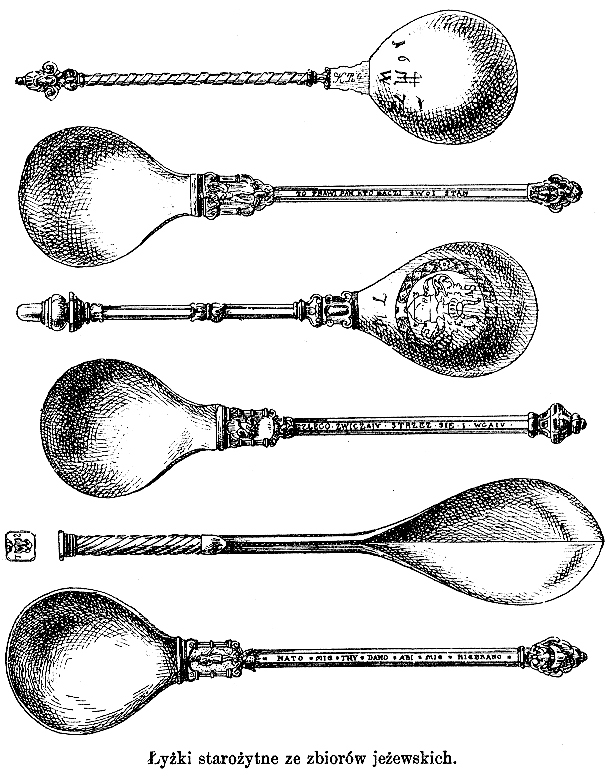Łyżka renesansowa (2. poł. XVI–XVII w.) miała płytki kolisty czerpak przechodzący w trzonek graniasty (niekiedy skręcony) lub płaski, zwężający się ku końcowi, zakończony sterczynką. Na ogół były to łyżki kute w całości, o długości ok. 20 cm. Na trzonkach wybijano zwykle w języku polskim sentencje, przestrogi i morały (np.: Pamiętaj człowiecze-że cię nie długo na świecie; O łyżke nie prosi, kto ją ze soba nosi; Mnie kto skryje – bardzo moi pan bije; Nie kładź mię zanadra – bym ci nie wypadła; Pierwsza potrawa – szczerość łaskawa; Bez łyżki zła strawa – chociaż dobra potrawa; Kto komu jamę kopa – sam w nię wpada; Nie opuszczaj cnoty dla pożytku). Dekoracyjność tych przedmiotów wzmacniało łączenie czerpaka z trzonkiem, w formie płytki z przedstawieniami apostołów, rycerzy, a niekiedy herbów lub puttów. Na stołach w najbogatszych domach używano łyżek srebrnych, niekiedy złotych lub złoconych, dekorowanych masą perłową itp. Stanowiły one wyposażenie prywatne bogatego człowieka, oznakę osiągniętego dobrobytu, efektowną ozdobę stołu, a oprócz tego doskonałą lokatę kapitału. Łyżki wraz z nożami noszono ze sobą, w cholewie lub w specjalnych futerałach u pasa, ponieważ nawet w najbogatszych domach nie podawano ich do stołów.