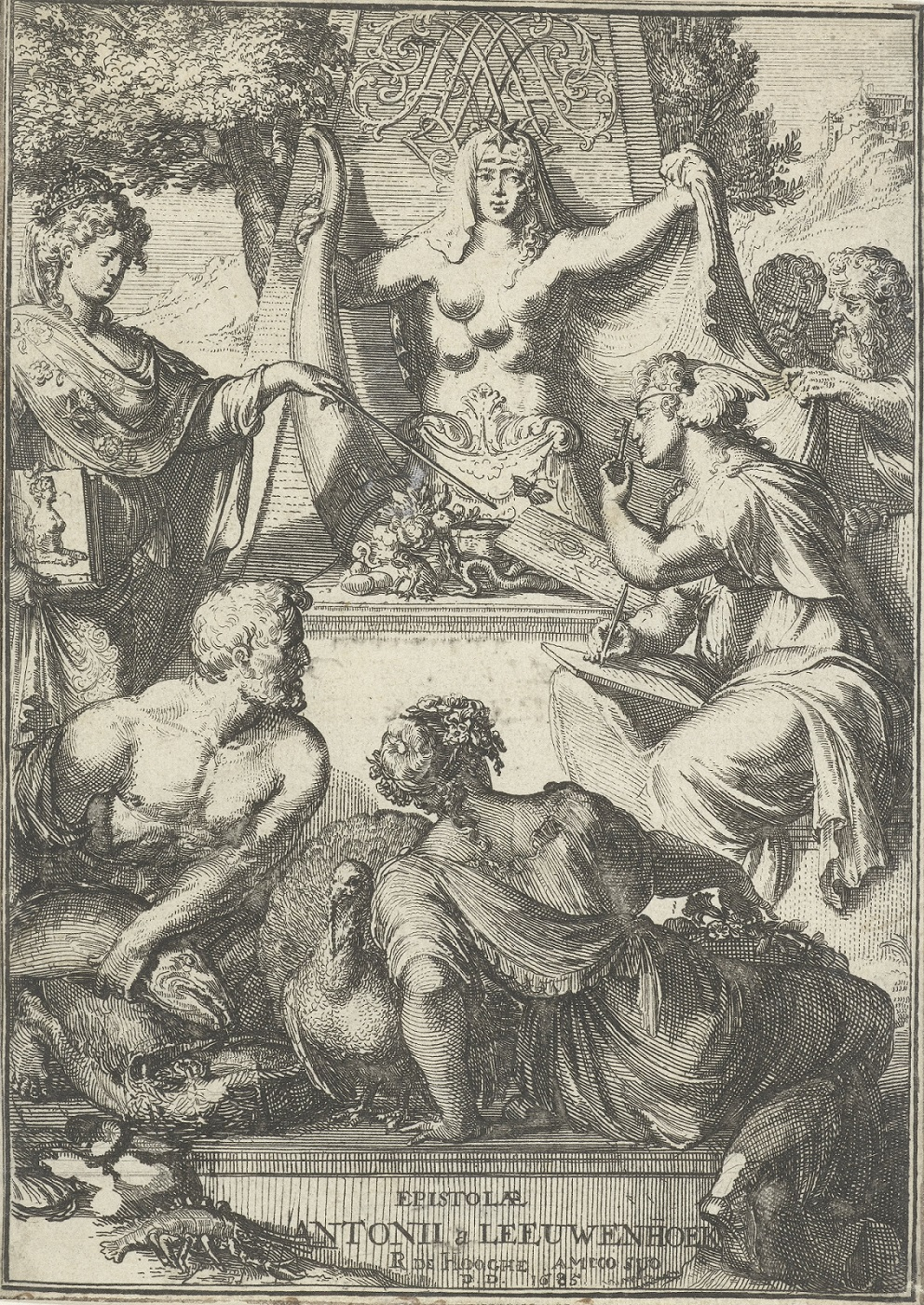 Przyjrzyjmy się bliżej tej ilustracji (il. 1). Jest to frontyspis jednego z kilku tomów Ontledingen en Ontdekkingen Antona van Leeuwenhoeeka, pochodzącego z Delft kupca, naturalisty oraz twórcy mikroskopów. Dołączono go do woluminu wydanego w 1686 roku, a prezentowaną rycinę opracował rok wcześniej Romeyn de Hooghe, przyjaciel autora i wszechstronny artysta, zajmujący się medalierstwem, miedziorytnictwem, malarstwem, rzeźbiarstwem itd.