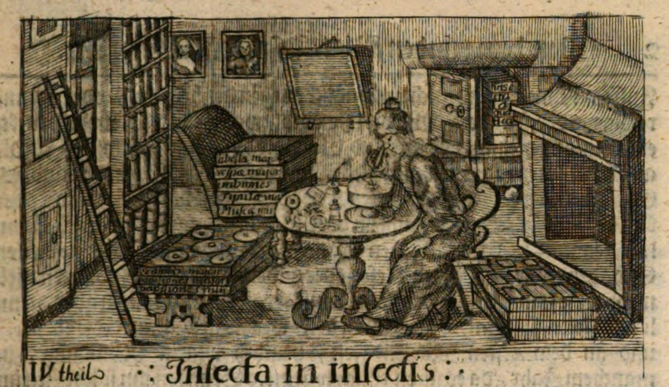 Tak czy inaczej, dzięki mikroskopom (ale nie tylko nim, by być szczerym) pchły, wszy, roztocza, muchy i inne owady, także te szlachetne, na progu XVIII wieku w badaniach z zakresu historii naturalnej zaczęły powoli zajmować uprzywilejowaną wcześniej pozycję roślin. W 1720 roku Johann Leohnard Frisch opublikował pierwszą część Beschreibung von allerley Insecten in Teutsch-Land, nebst nützlichen Anmerckungen und nöthigen Abbildungen von diesem kriechenden und fliegenden inländischen Gewürme. W wydanej w 1730 roku części czwartej tej wielotomowej publikacji na jednej z rycin (il. 2) ukazano badacza używającego mikroskopu. Mężczyzna znajduje się w swoim gabinecie, gdzie mieści się także jego biblioteka oraz gdzie można spostrzec szafy-repozytoria , kryjące naturalia. Na jednym z krzeseł i na mniejszym stoliku ułożono szuflady-przegródki, które zawierają w sobie ułożone w jakimś porządku zakonserwowane insekty. Na stole-biurku leżą z kolei mikroskopy, ich elementy, szkła powiększające, a także inkaust, pióro i papier. Prowadząc obserwację uzbrojonym okiem, trzeba przecież gdzieś zapisać jej wyniki.