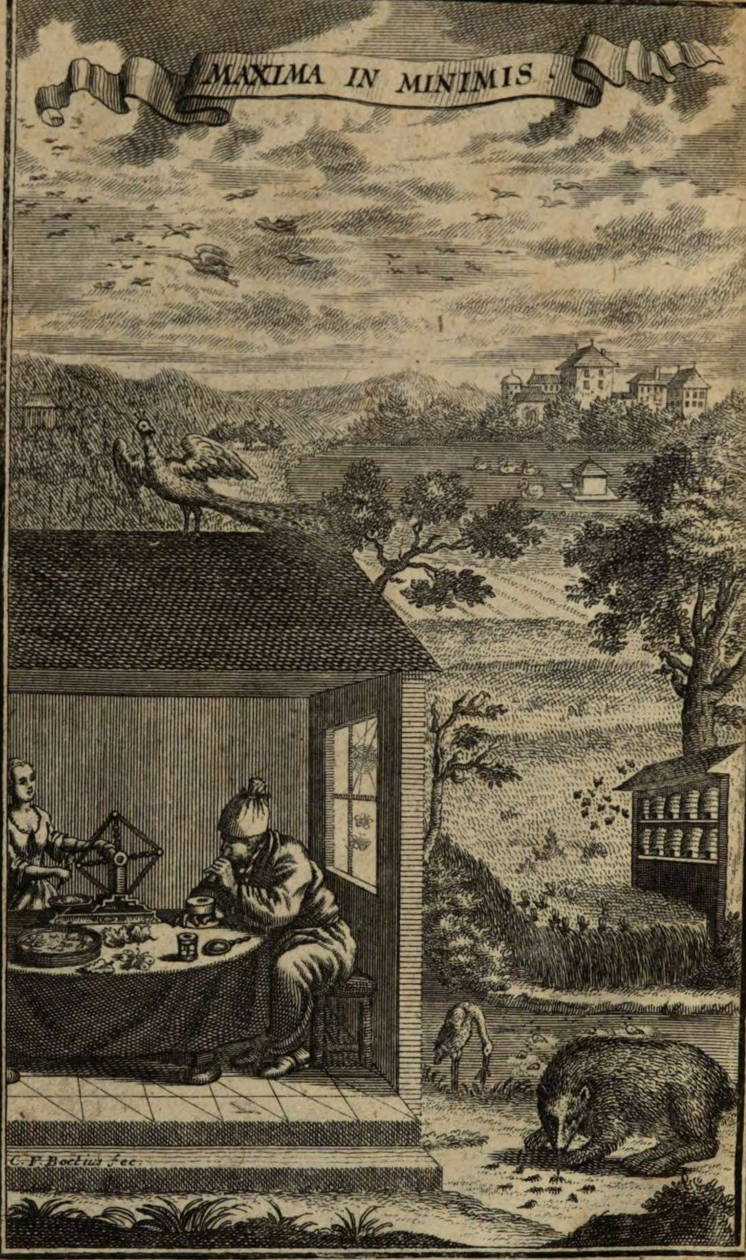 W 1738 roku światło dzienne ujrzała z kolei praca Friedricha Christiana Lessera Insecto-Theologia, Oder: Vernunfft- und schrifftmaessiger Versuch, wie ein Mensch durch aufmercksame Betrachtung derer sonst wenig geachteten Insecten zu lebendiger Erkaenntniss und Bewunderung der Allmacht, Weissheit, der Güte und Gerechtigkeit des grossen Gottes gelangen könne. I także na jej frontyspisie (il. 3) widać uczonego w trakcie prowadzonych przezeń badań. Mężczyzna, siedząc latem w przyjemnym chłodzie gabinetu, za pomocą mikroskopu odkrywa tajemnice owadów. Poprzez insekty udaje mu się z kolei rozpoznać maxima in minimis, wielkość natury ukrytą w każdym najmniejszym stworzeniu i detalu, a ostatecznie... poznać swego Boga.