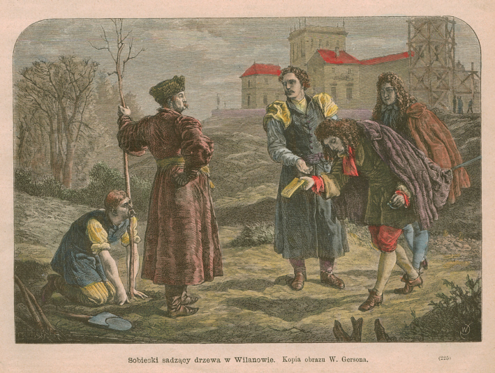 Jan III, szczerze nienawidzący etykiety, sadził osobiście lipy w ogrodzie wilanowskim, niczym prosty szlachecki gospodarz (wyobrazić sobie w tej roli Ludwika XIV w ogrodzie wersalskim byłoby raczej trudno). Taki właśnie moment uchwycił w swym zaginionym dziś obrazie warszawski malarz Wojciech Gerson (1831 – 1901). Monarcha, ubrany w zwykły ubiór staropolski, stoi, trzymając w lewej ręce młodą sadzonkę, którą obtyka ziemią klęczący obok ogrodnik. Sobieski przerywa na chwilę swoje zajęcie, wysłuchując oracji polecanego mu, pochylonego w ukłonie poety – ten wręcza mu swój egzemplarz Sobiesciady. W głębi, na wyżej usytuowanym terenie, wznosi się pałac wilanowski, częściowo w rusztowaniach.