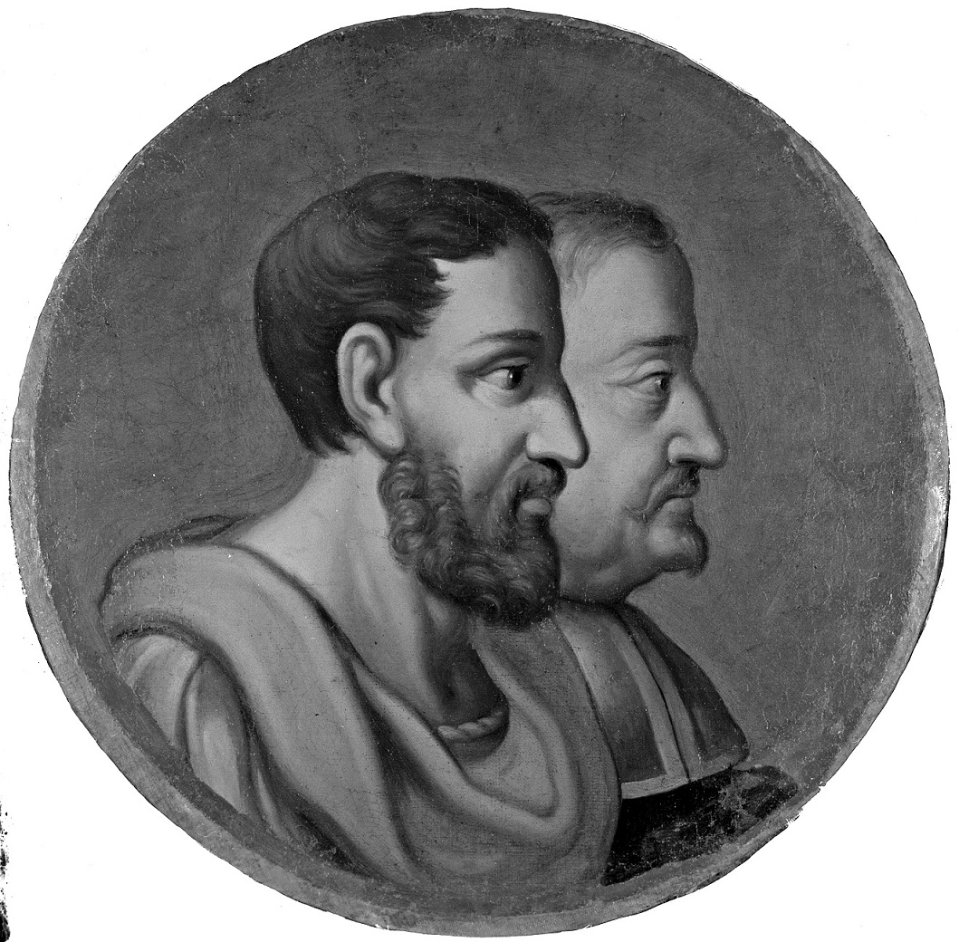 Tondo z wizerunkami dwóch mężczyzn. Pierwszy z ciemnymi włosami i brodą, drugi - za nim - z wąsem. Są to portrety  Arystotelesa i Lipsjusza z Biblioteki Króla w Pałacu w Wilanowie.