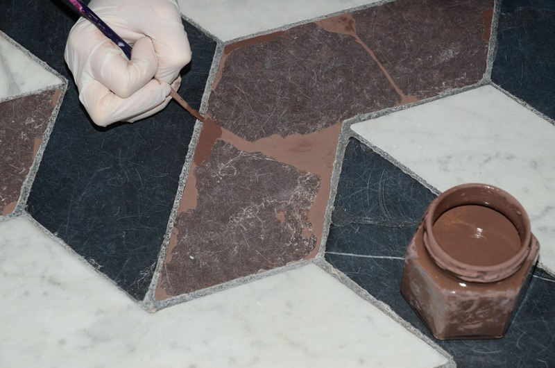 Kolorowe zdjęcie na którym widzimy zniszczony fragment posadzki. Po prawej stronie słoik z farbą, po lewej stronie ręka w białej rękawiczce z pędzlem. Jest to retusz uzupełnień posadzki w Bibliotece Króla.