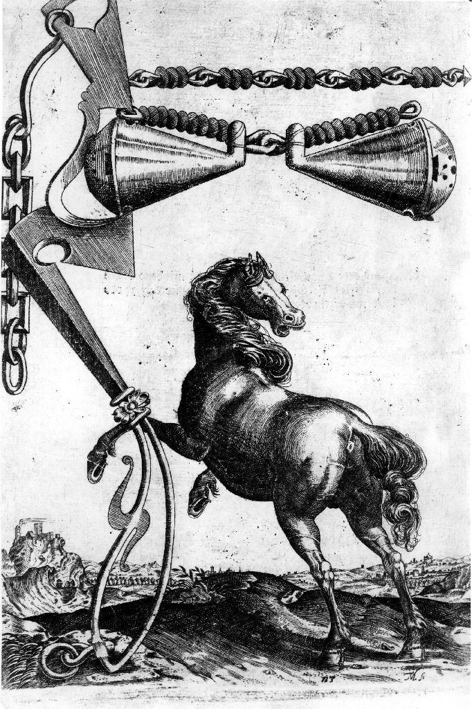 Grafika przedstawia konia w biegu, który odwraca głowę za siebie. Biegnie w stronę pól. Po boku i nad nim elementy uprzęży? Jest to grafika ze zbiorów Biblioteki Narodowej.